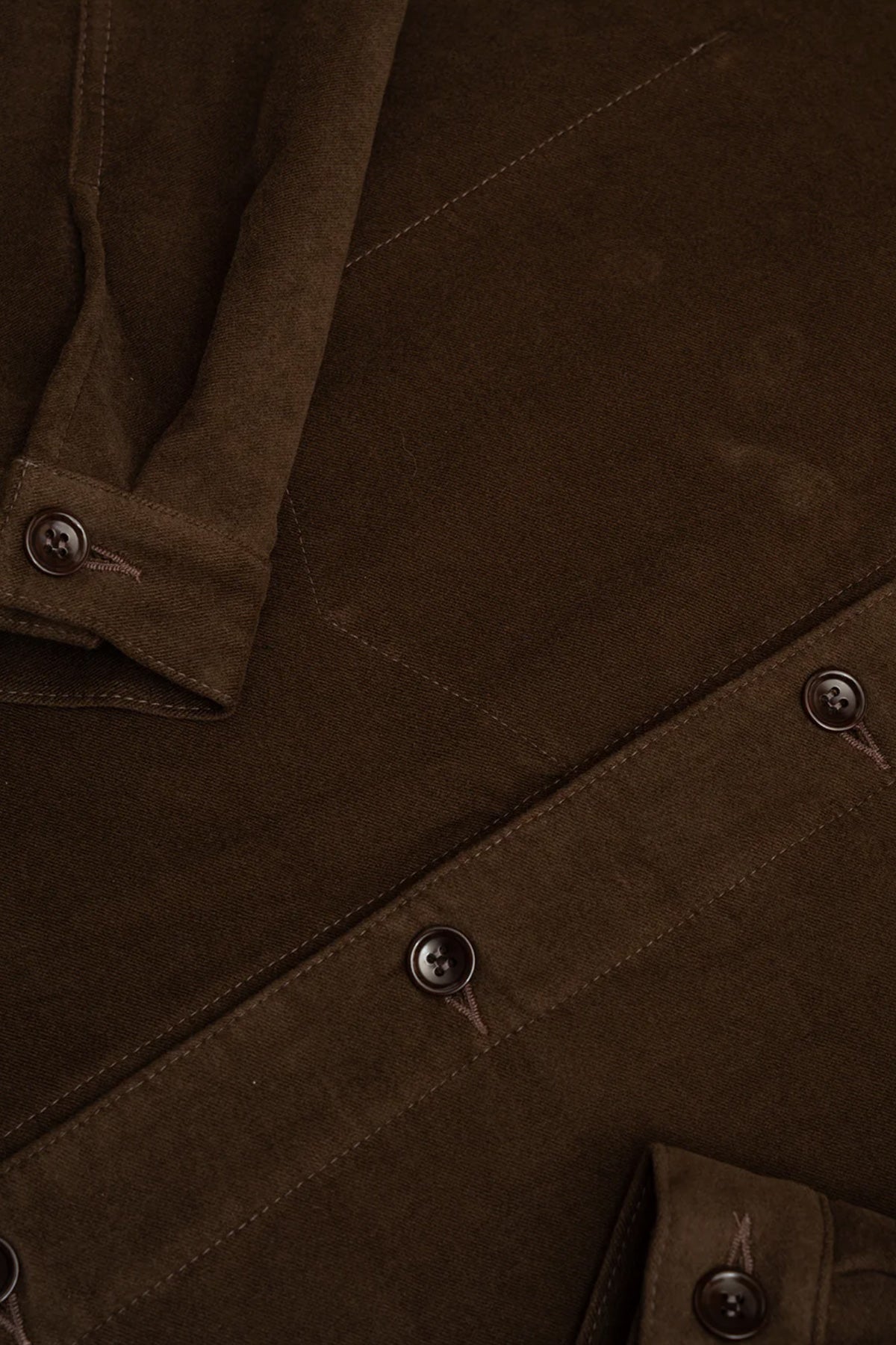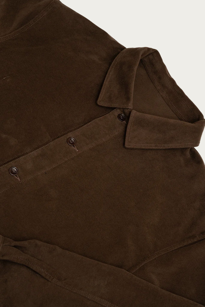 The Signal Shirt is rugged in fabric yet elegant in shape. Cut from a smooth Italian cotton moleskin, the dark brown tone feels earthy and rich, built to age with patina. It carries a refined collar and a quiet front placket that keeps the silhouette clean. The moleskin gives weight without stiffness and works well as either a shirt or a light overshirt.