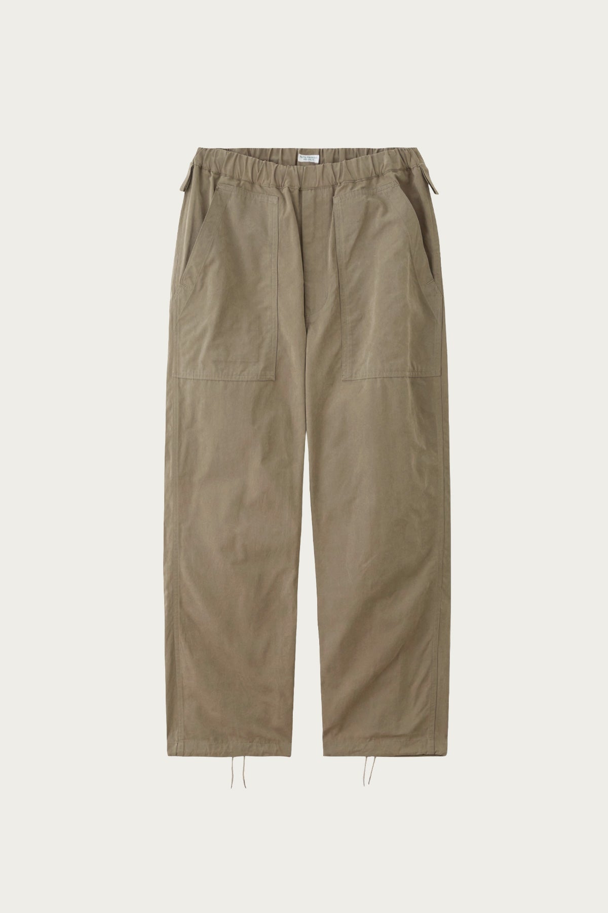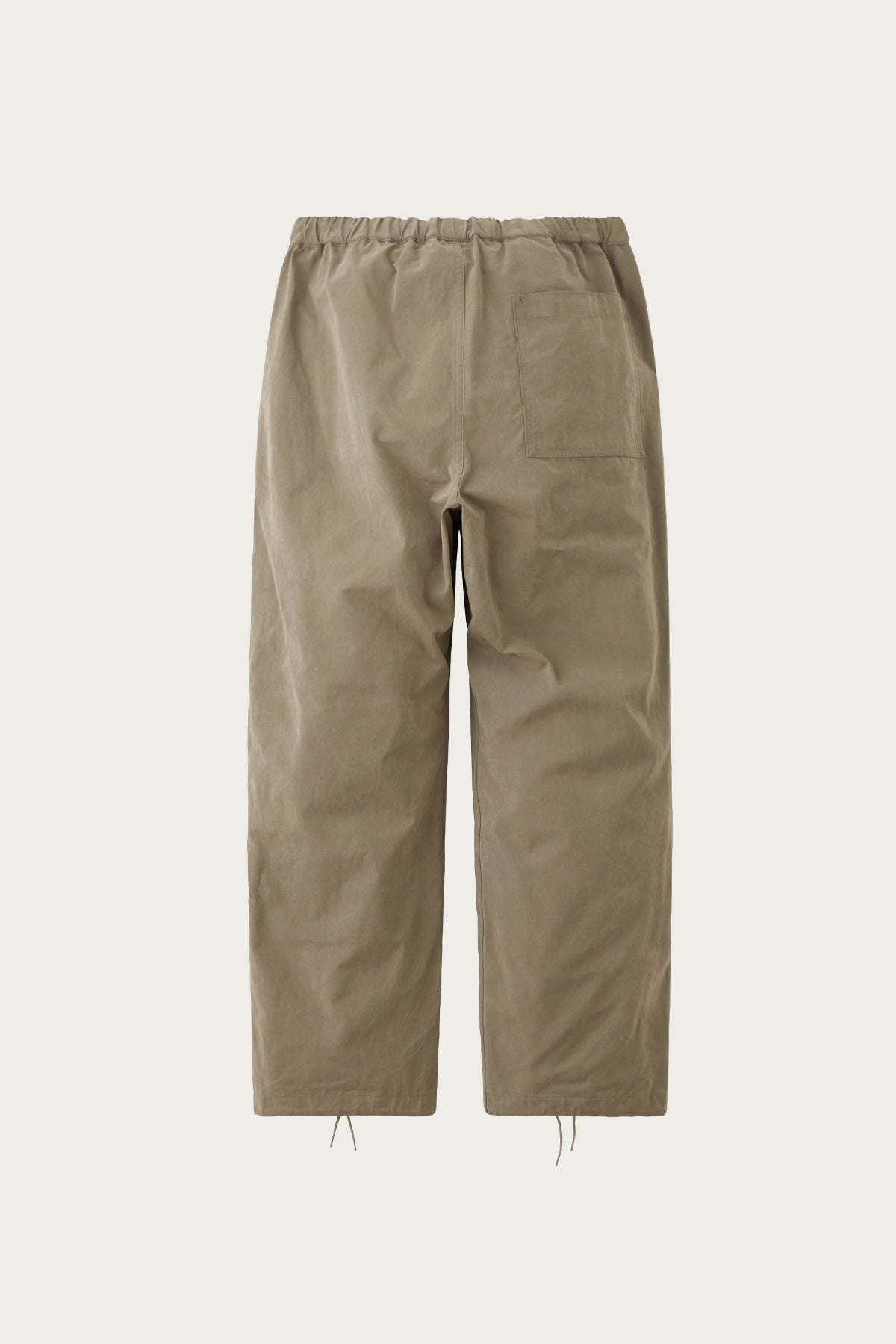 The Waxed Cloth String Trousers in Taupe Beige bring workwear grit into quiet refinement. Cut from wax-finished cotton cloth that softens with time without losing resilience, the silhouette features a draw-string waist for comfort and a clean straight drop through the leg. The Taupe Beige tone sits comfortably between utility and understatement-- a pant you’ll wear a lot without thinking about it.