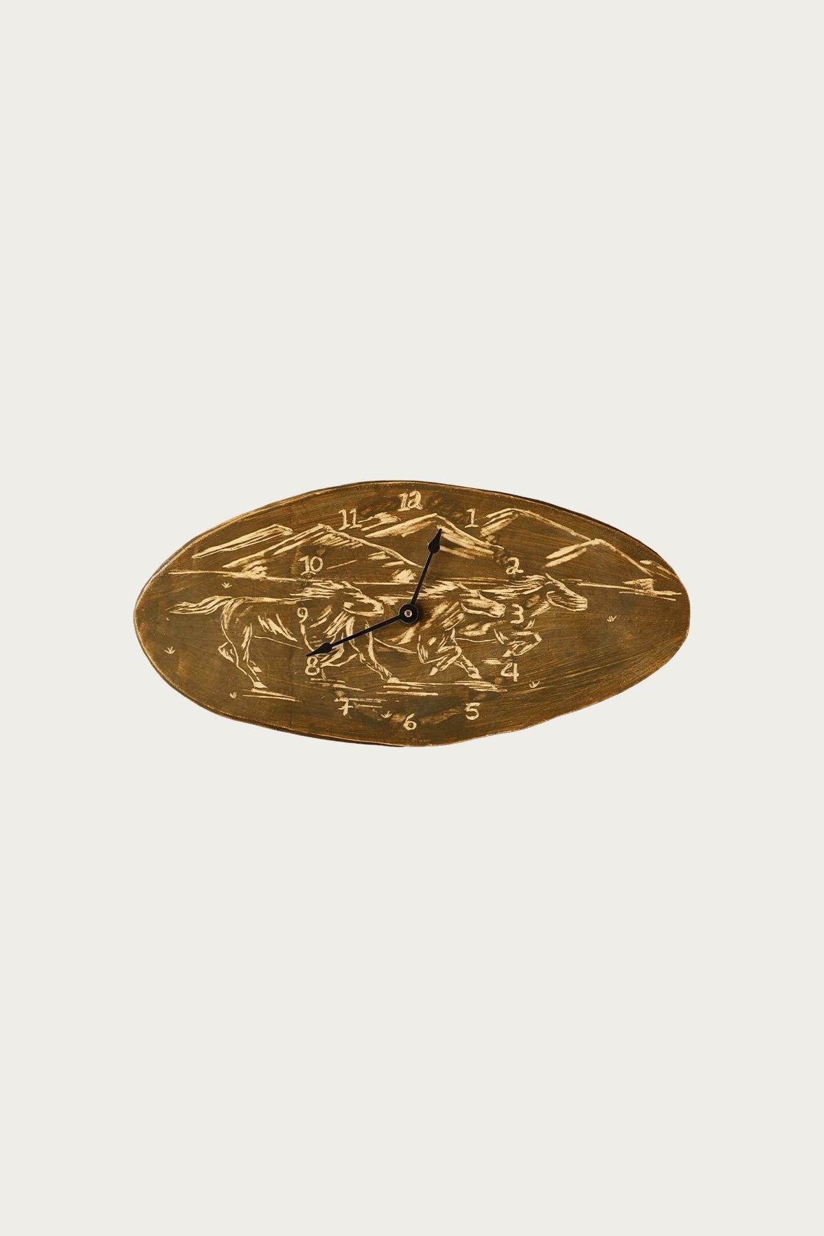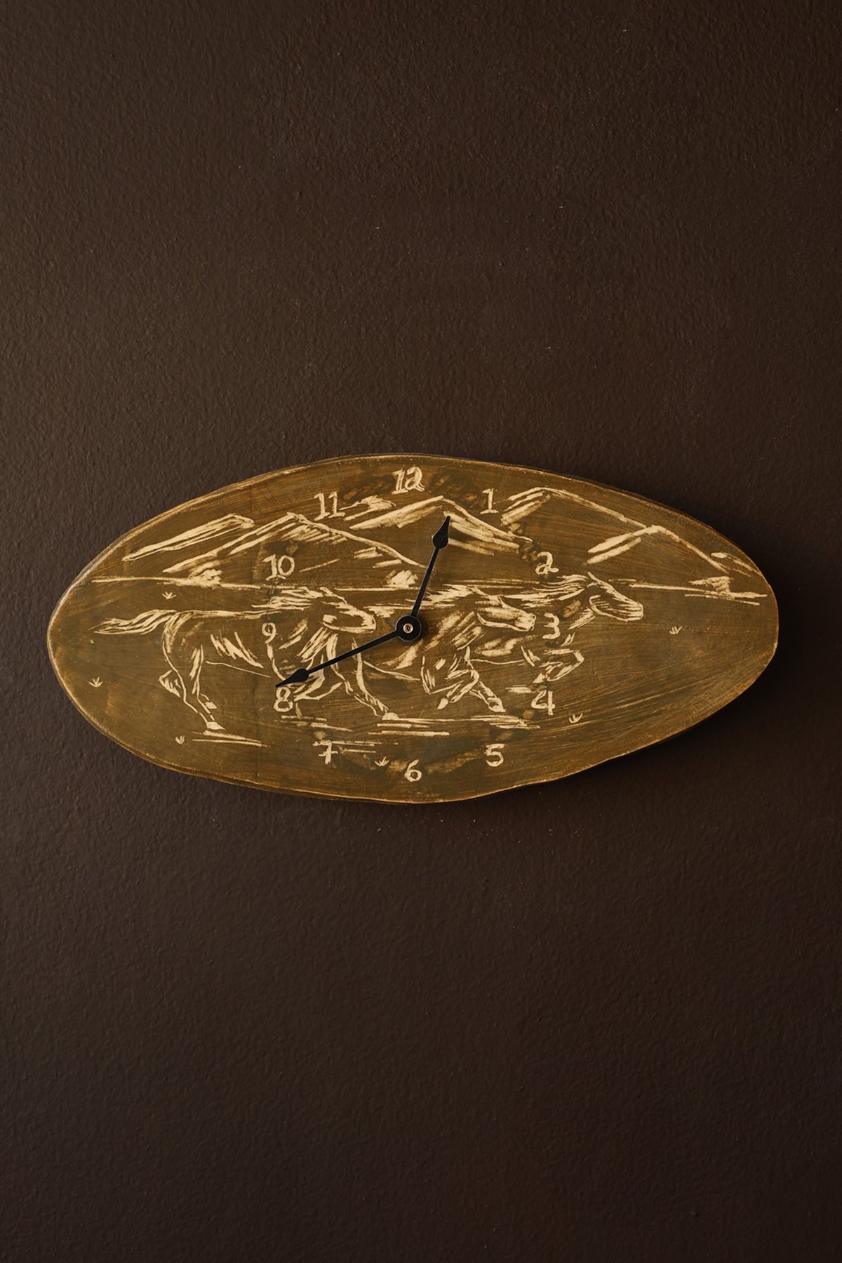 A nod to the American West, this olive-hued ceramic clock captures the movement of wild horses across an open plain. Each one is sculpted and painted by hand, giving it a lived-in charm and rustic finish. The oval shape and earthy color palette make it a subtle statement piece wherever it hangs.