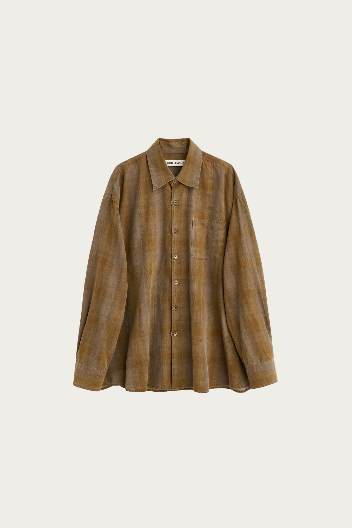 Our Borrowed Shirt in Dakota Flannel Check. Produced in a Portuguese cotton flannel woven in a durable twill with a classic check, the men's Borrowed Shirt has an oversized fit and features a pigment-coated surface that has been washed back for a lived-in tone, mother of pearl buttons, mitered cuffs, a curved hem and a single chest pocket.
