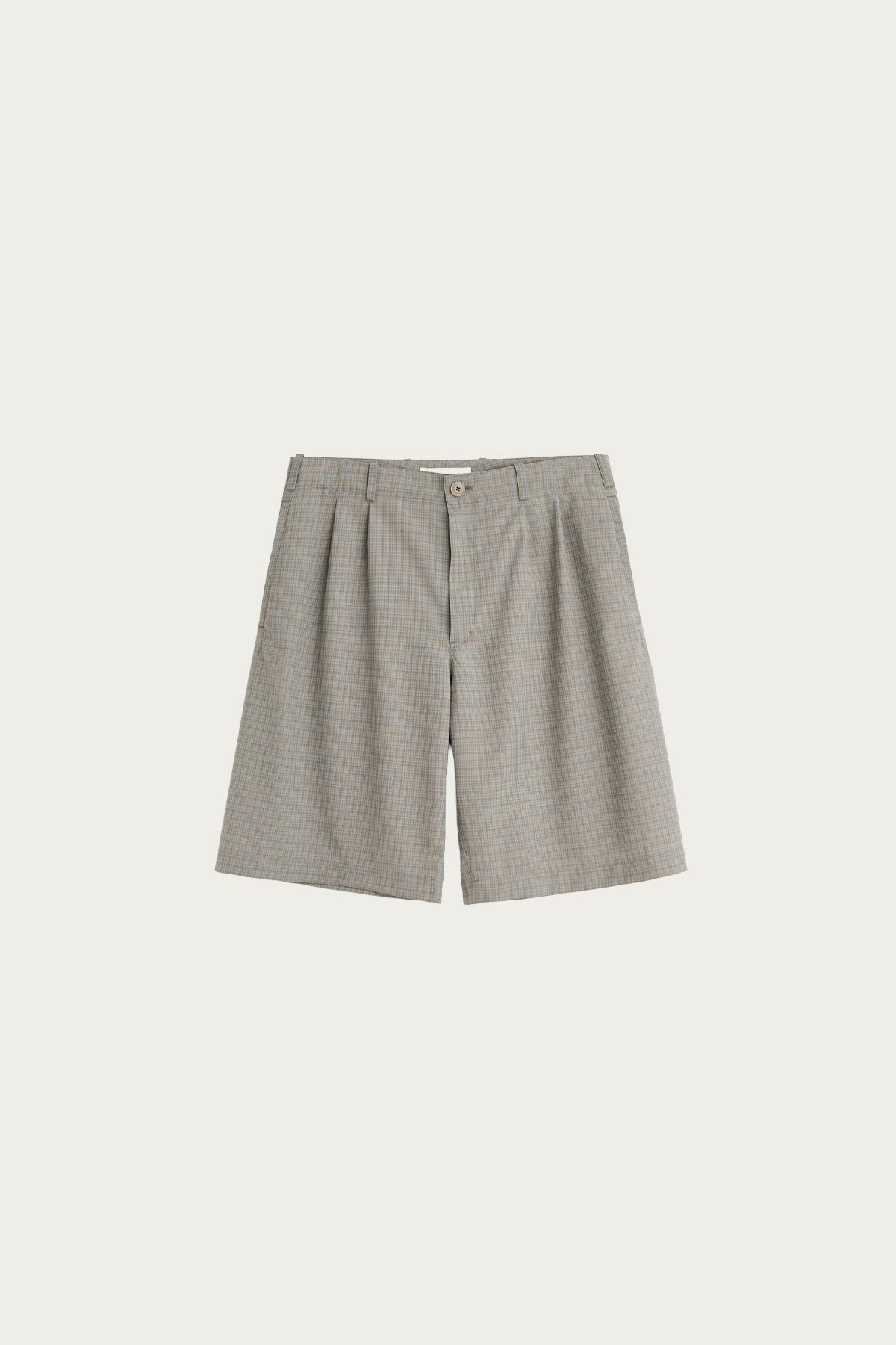 Relaxed pleated shorts made from Our Legacy’s NexWool fabric in a Frosted Moss check pattern. The lightweight wool blend gives the shorts structure while maintaining breathability and softness.
