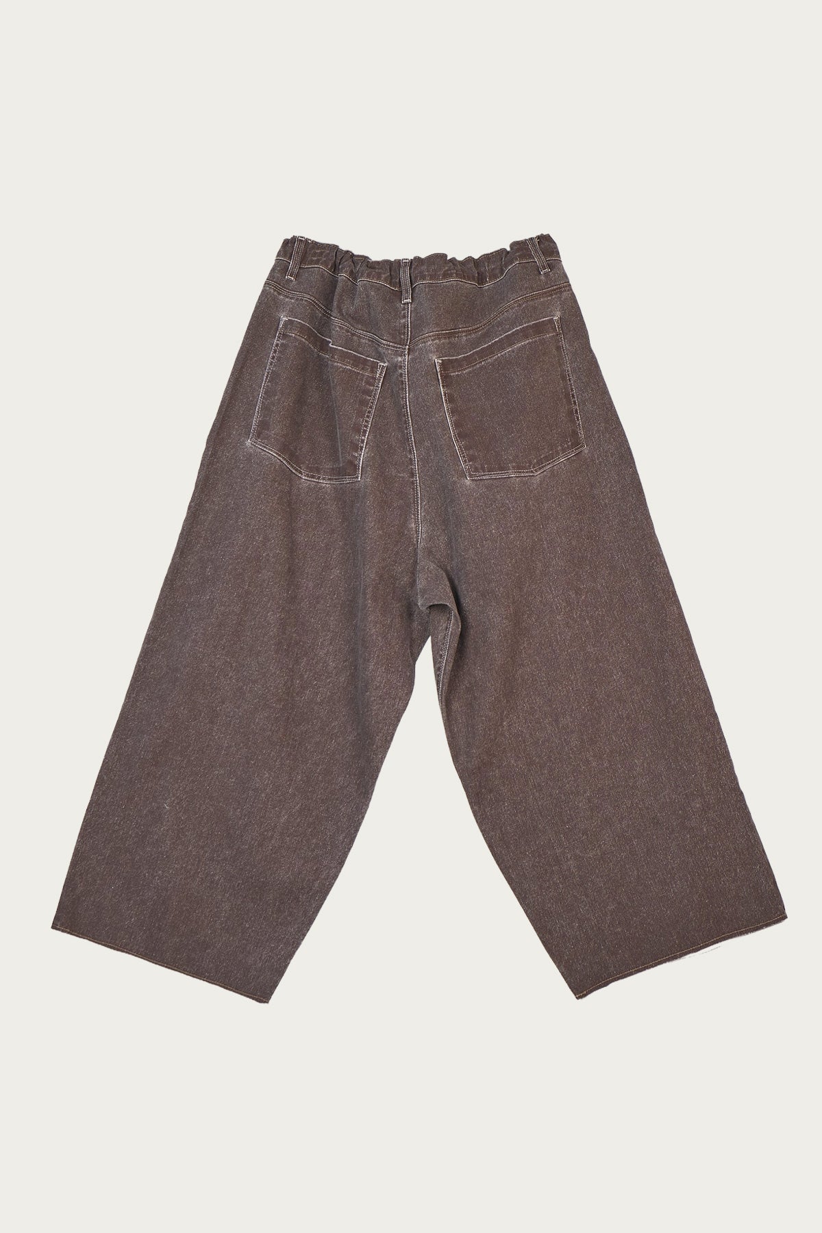 The Big Jeans from Camiel Fortgens take familiar denim structure and twist it into something raw and imperfect in all the right ways. Made from coated brown twill, they carry a subtle sheen that breaks in beautifully, softening and creasing with wear. The relaxed, wide leg drapes with easy volume, while details like the adjustable drawstring waist, irregular topstitching, and raw edges show Fortgens’ handmade, unpolished character. Finished with round front pockets, patch back pockets, and a horn button at the waistband, these are everyday jeans that feel a little off-center, in the best possible way.