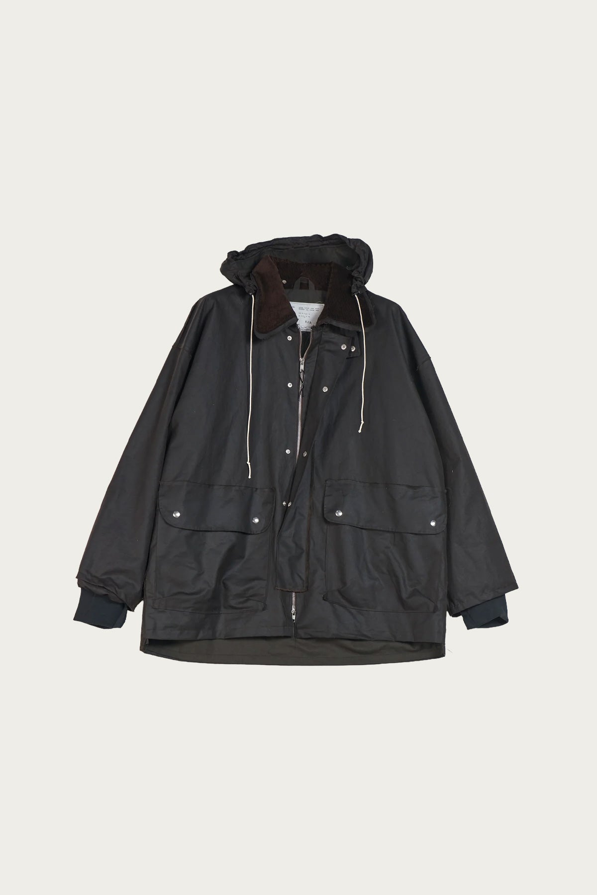 The Outdoor Hunting Jacket from Camiel Fortgens feels like something pulled out of an old English countryside wardrobe and rebuilt by hand. Made from a water-repellent waxed cotton, it takes cues from British hunting and fishing coats: tough, functional, and meant to age with you. The detachable hood is wired and adjustable, giving it structure, while the corduroy-faced collar adds warmth and contrast. Extended raw seams, uneven stitching, and a mix of textures remind you this is Fortgens’ world, where imperfection is the point. The fit is big and easy, ready to layer over knits and hoodies when the weather turns.