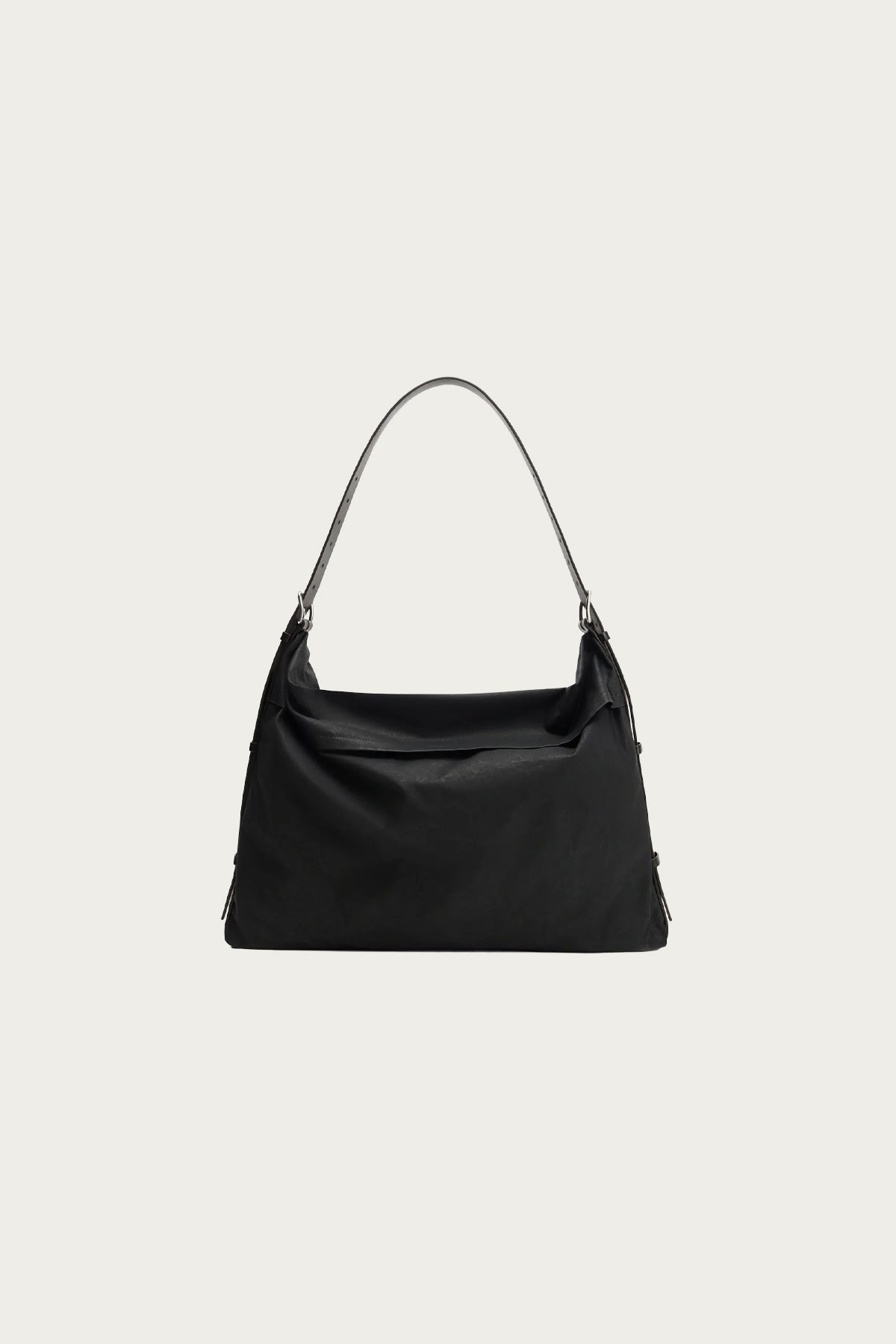 The Trench Pocket bag is imagined as a continuation of the silhouette, extending the garment with a utilitarian textile accessory. Inspired by the piece from which it takes its name, it features a belt-like leather shoulder strap. Made from GOTS-certified resinated cotton canvas with water-repellent treatment, this medium bag is ideal for everyday use. With time and movement, the fabric develops a patina, giving it a vintage look.