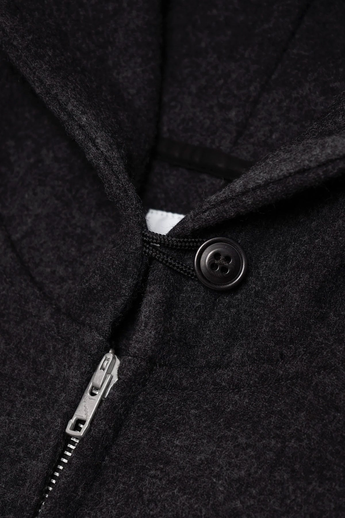 The Wool Zip Hoodie is a wide, boxy-fitting hooded jacket with a shorter body. Cut from a 100% wool knit in Japan, the heavyweight fabric has a light and straight drape. The 2-piece sleeve curves along the natural posture of the arm.