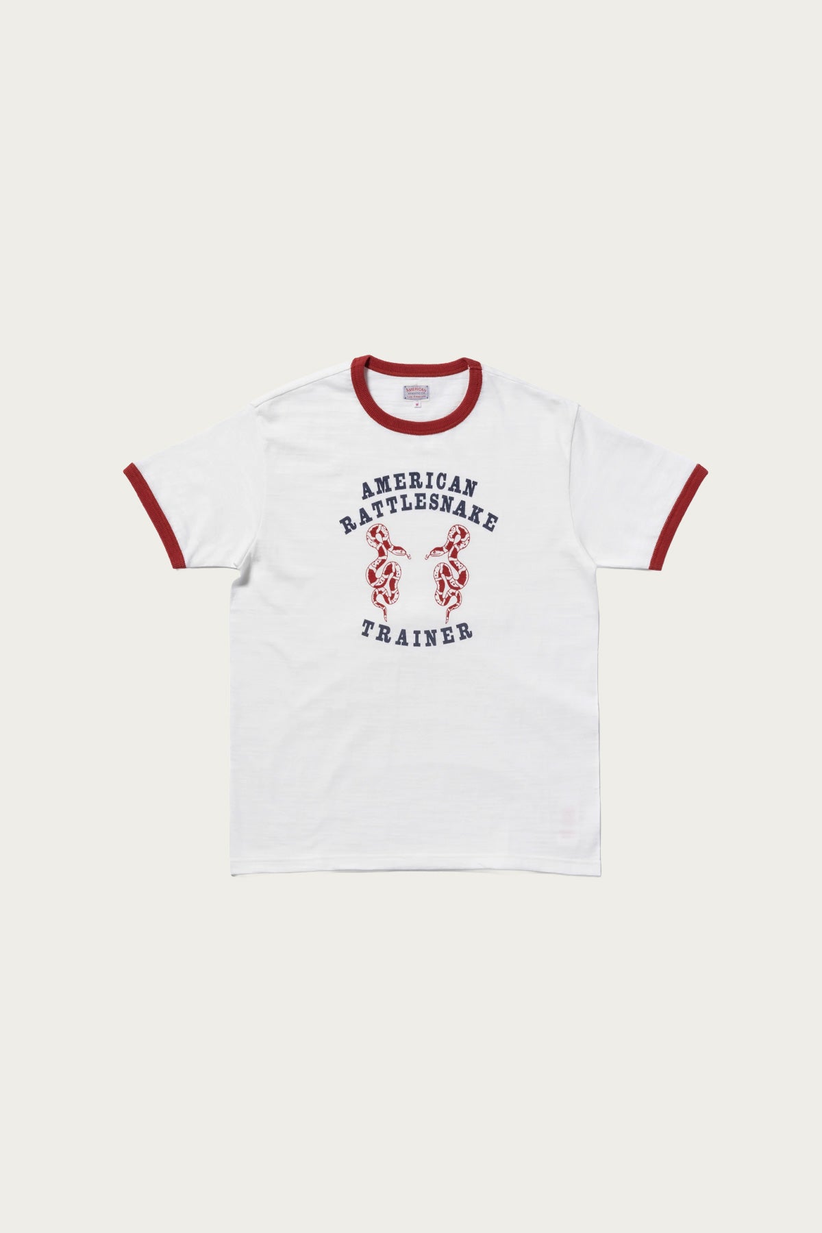 A ringer tee with craft and character, the Rattle Snake Trainer tee is built from 6.8 oz loopwheel cotton knit. Its seamless, slow-knit construction means it stretches and recovers naturally, giving it a hand-woven feel you don’t find in mass tees. The bold “Rattle Snake Trainer” graphic is hand-applied in rubber print at McCoy’s Kobe workshop, giving each shirt personality and depth. In Milk with Cherry contrast bands, it balances vintage energy and everyday wearability with quiet confidence.