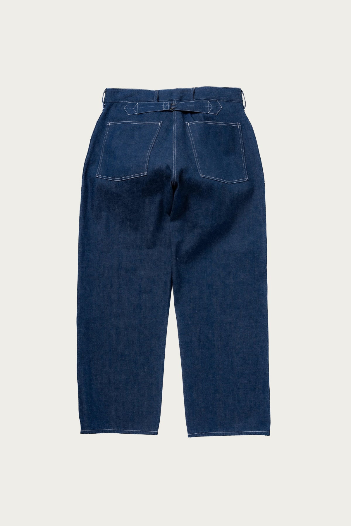 The Real McCoy’s Working Denim Trousers in Indigo bring together military heritage and Japanese craftsmanship in one rugged yet refined piece. Modeled after the U.S. Army’s 1919-adopted blue denim fatigue trousers, these are built with nearly identical patterning, including the rear cinch back, that was standard until 1937. The fabric is a lightweight 10-oz denim woven with an unbleached weft for crisp indigo depth and vintage character from day one. Design details like large front patch pockets (plus a coin pocket), twin rear pockets, white contrasting stitching, and a button fly keep the workwear roots true. Made in Japan by expert artisans, every pair feels like it has a story already woven in.