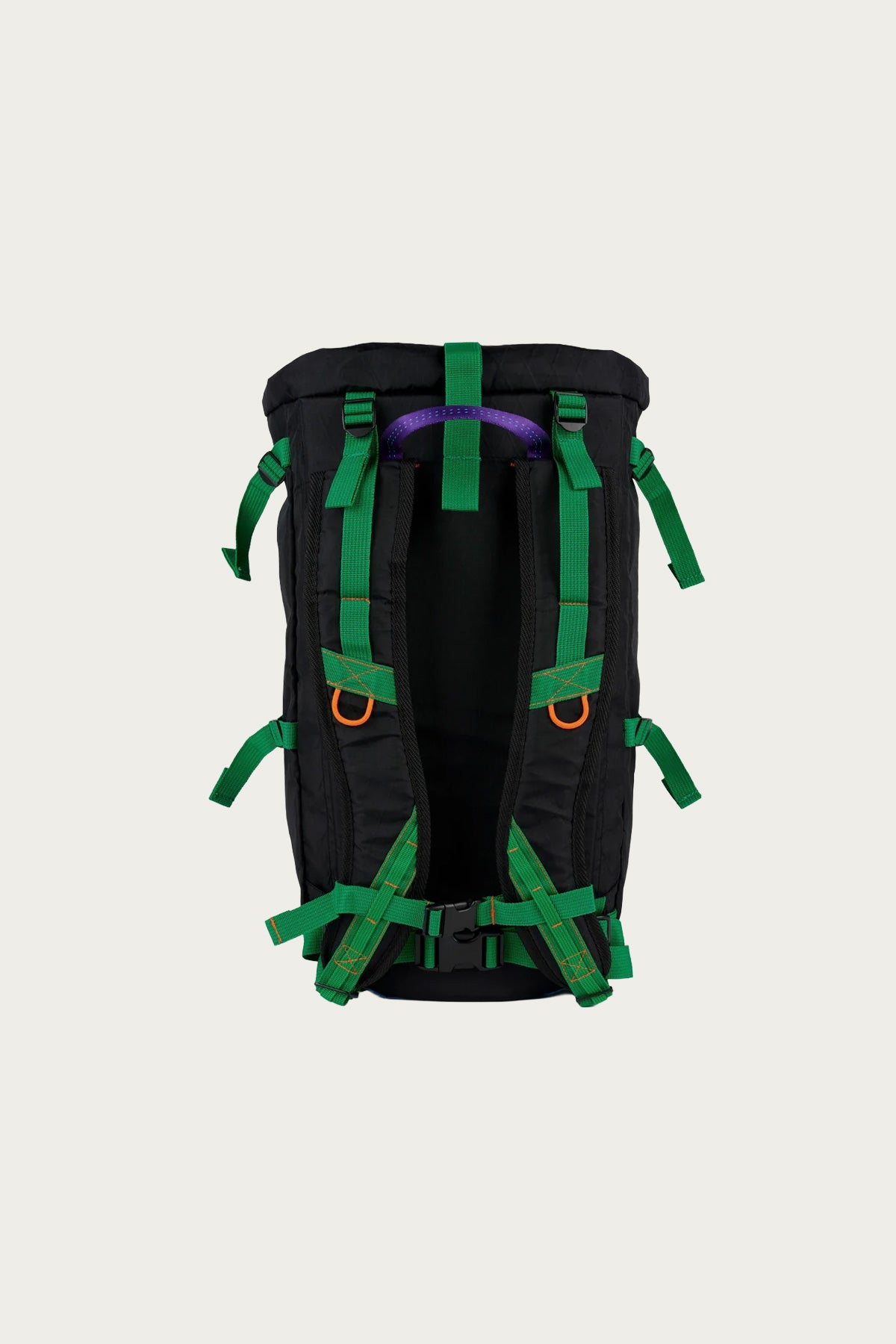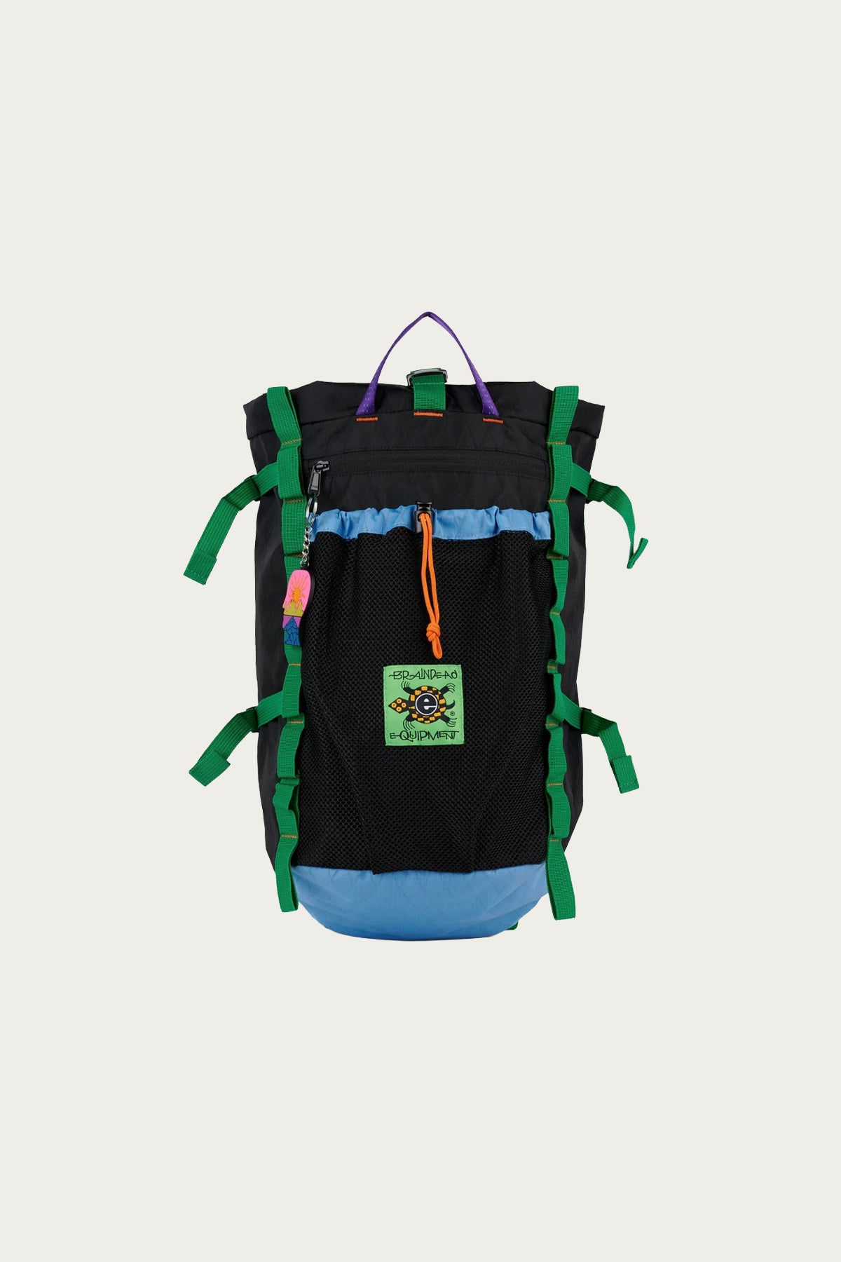 Brain Dead's nylon climbing day bag with zippered and drawstring pockets. Features woven Brain Dead Equipment patch on the front and logohead keychain zipper pull.