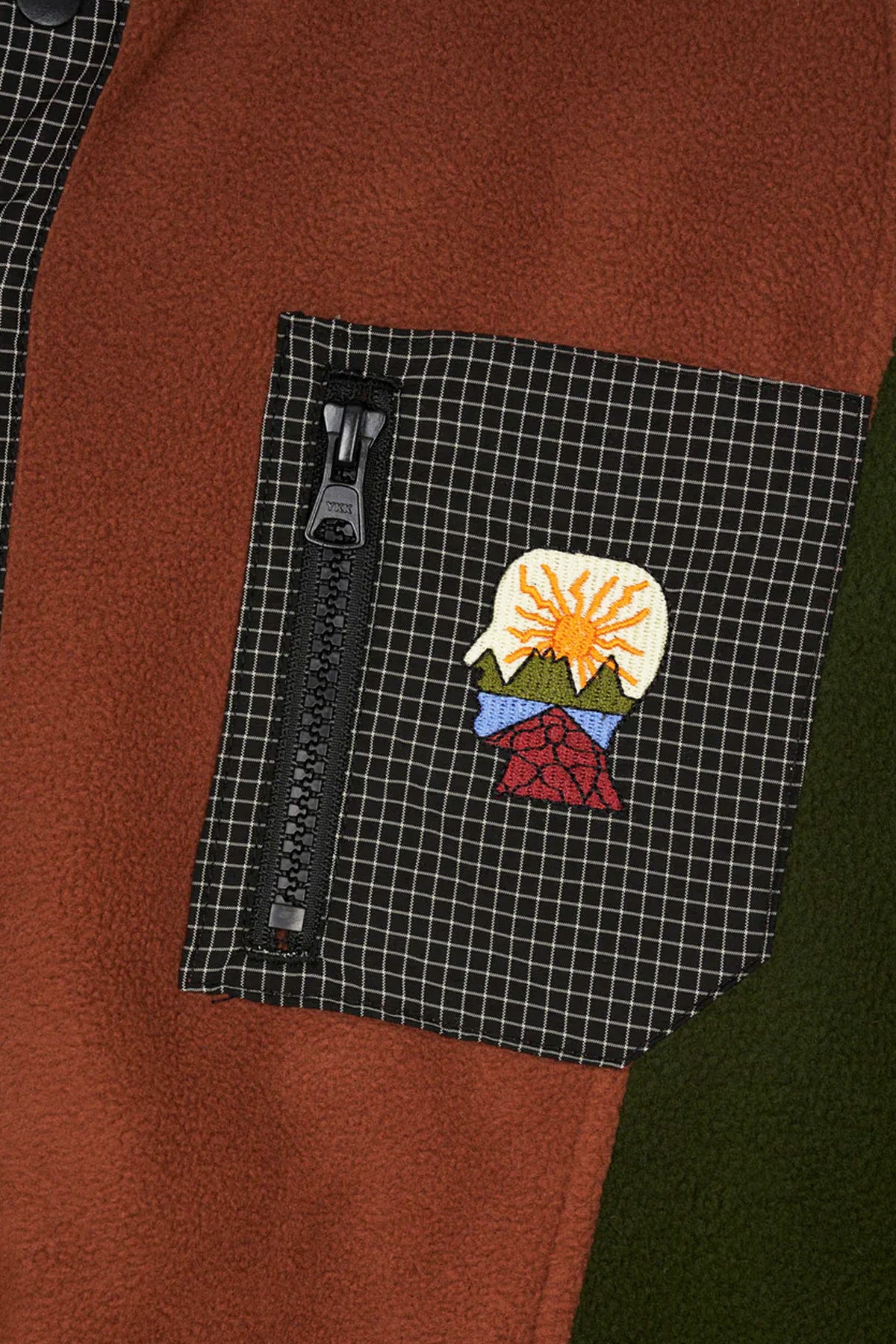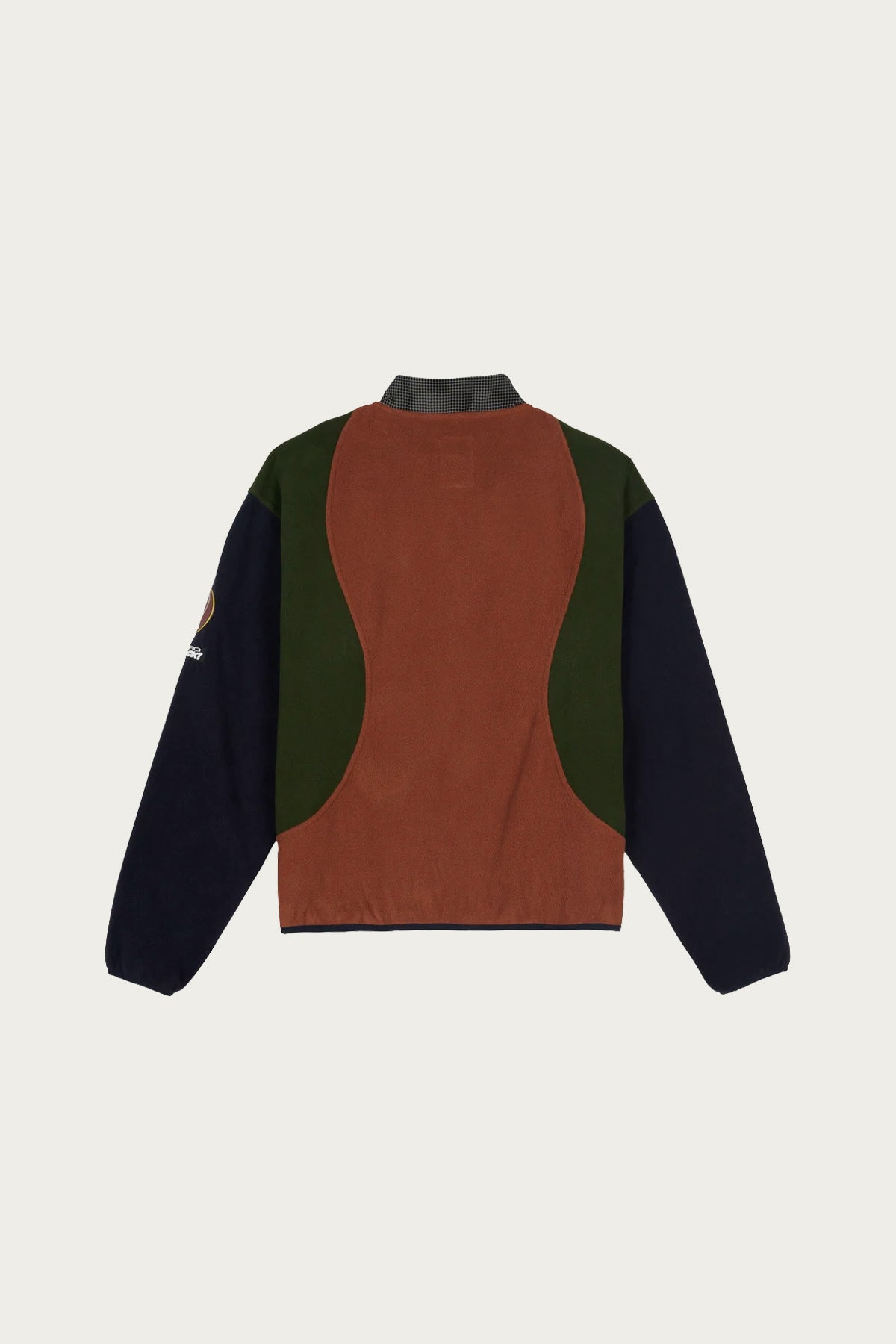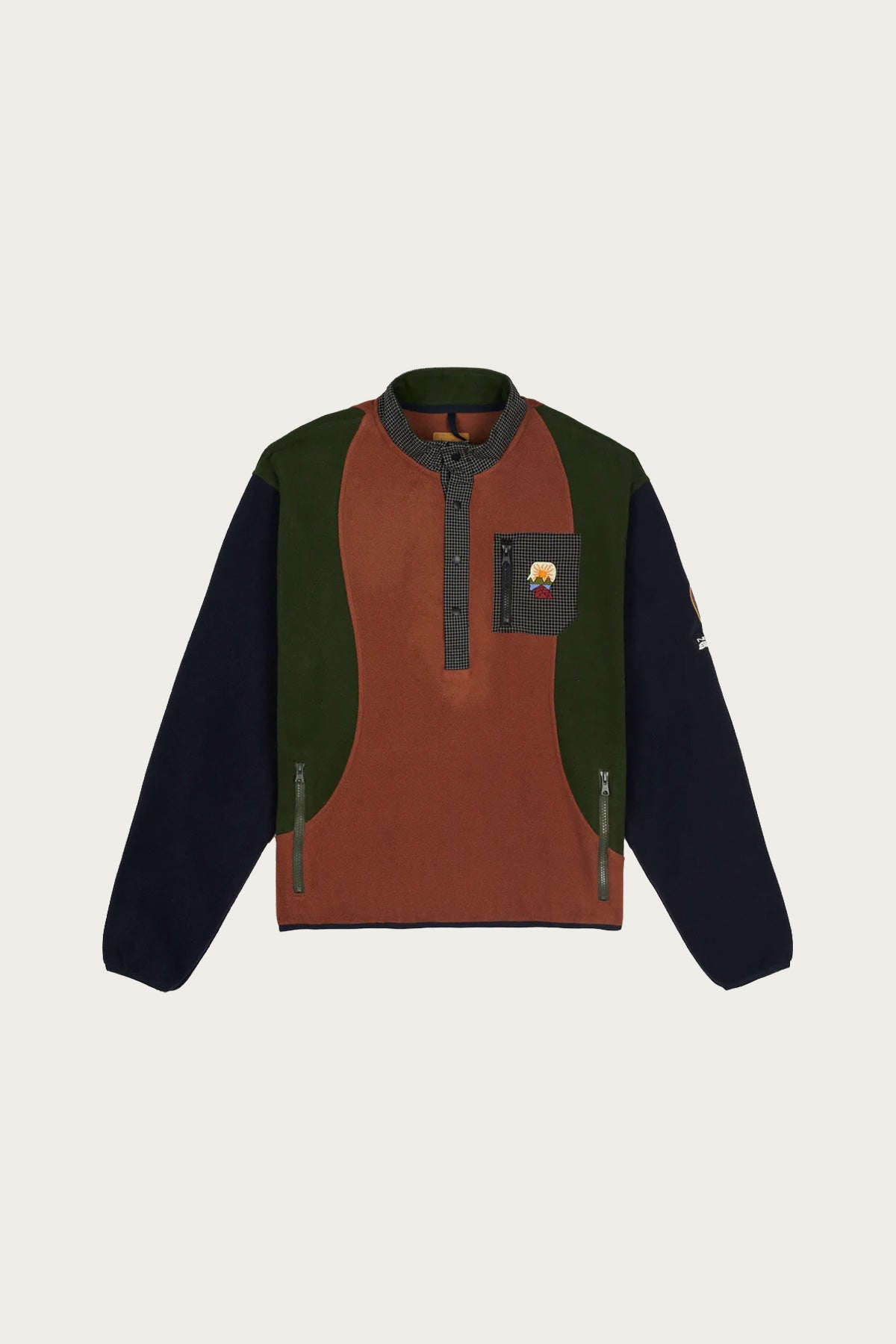 Our lightweight polar fleece with contrast crinkle grid ripstop placket and chest pocket. Brain Dead Equipment chest embroidery, PVC sleeve patches, snap front closure, and stretch taping at cuffs and hem. Color-blocked curved paneling, cropped fit, and dropped shoulder.