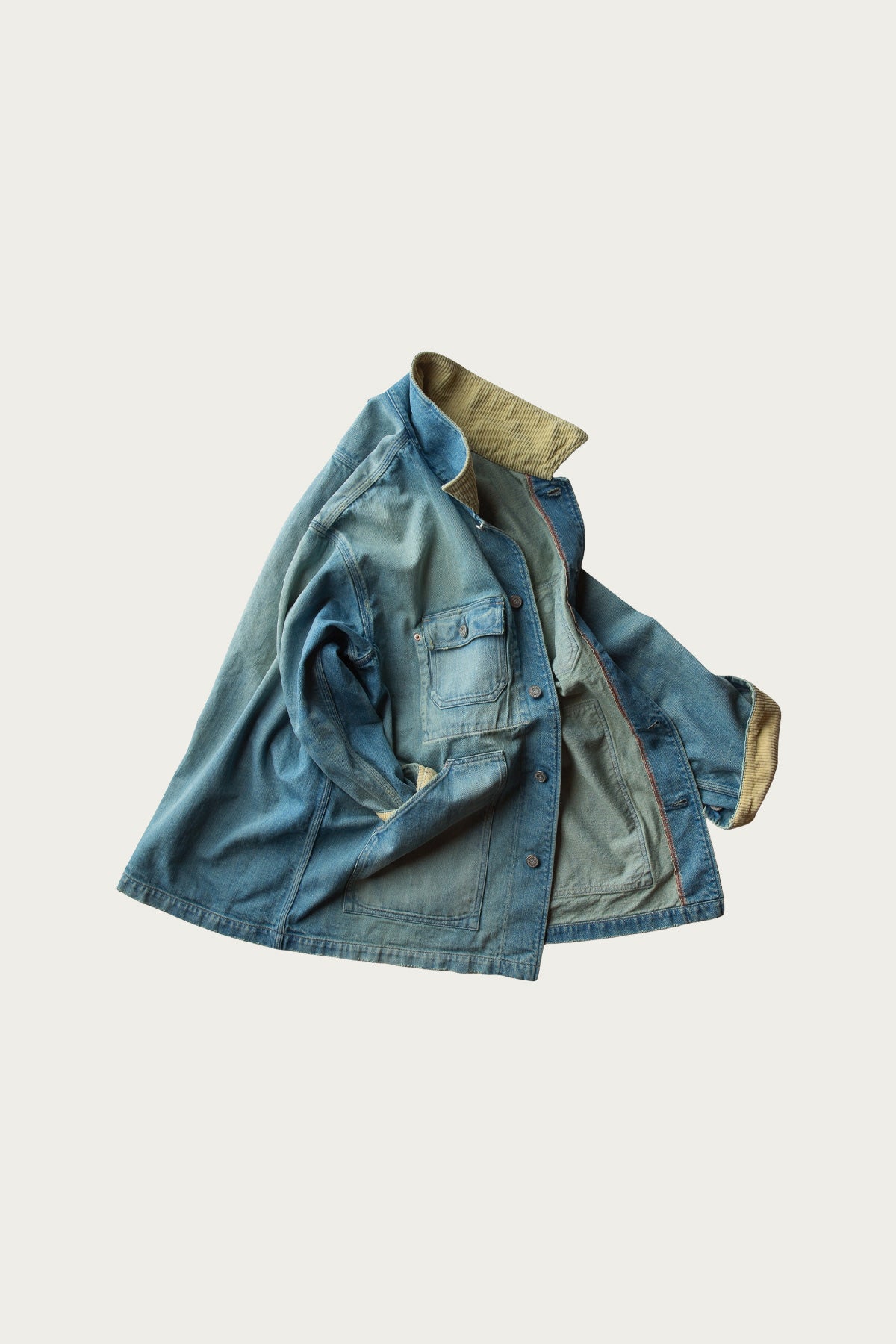 A coverall that feels rooted in folk craft yet refined through careful construction. This piece is cut from Cottle’s signature 11.3 oz cotton-linen Bengara denim woven on a shuttle loom. It features a rich, nepped texture and tapestry-like selvedge in warm orange tones that peek out along the interior facing and neck loop. The silhouette is relaxed with slightly dropped shoulders, a classic collar, straight button-front, and thoughtful utility details like a left chest pocket, two waist patch pockets, a reinforced two-layer rear yoke, and engineer’s cuffs with split side seams. Durable chain-stitched, flat-felled seams and cupped metal buttons make it ready to evolve with wear.