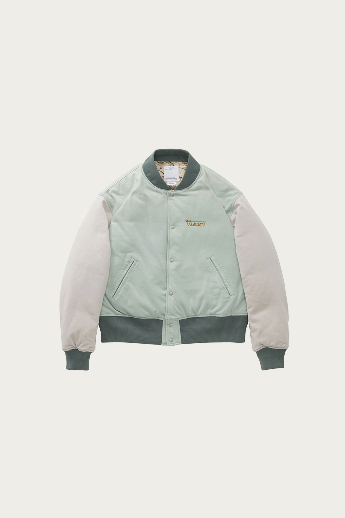 A varsity-inspired down jacket that balances warmth with a streamlined profile. The padded body provides insulation without excessive bulk, while ribbed trim and snap closures maintain a classic athletic feel. Finished with Visvim branding and a smooth lining for comfort.