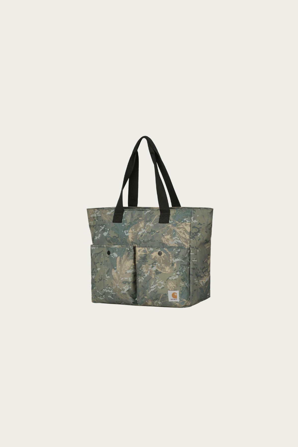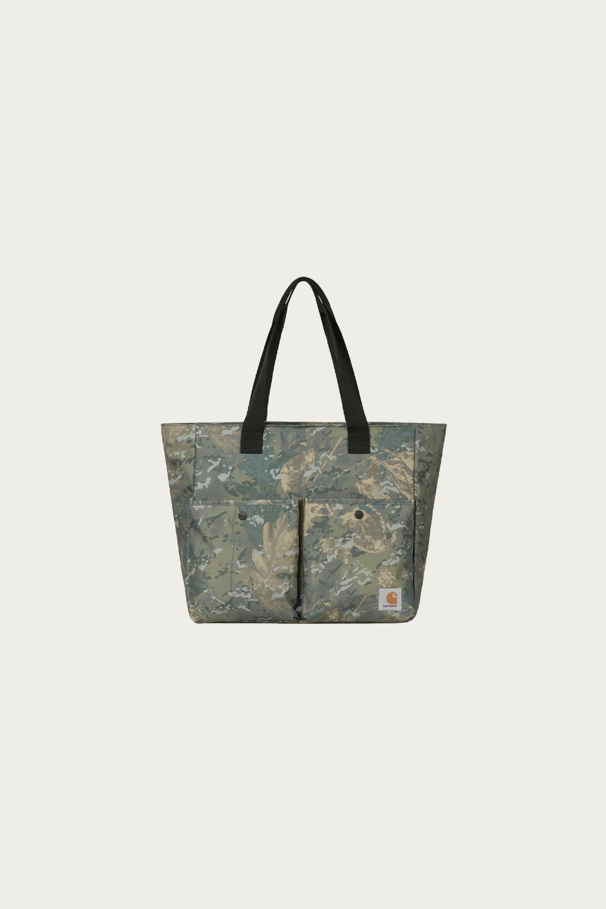 The Jake Tote Bag is made from a heavyweight polyester canvas. The style features a zipped main compartment. Two pockets appear on the inside, and two snap-button pockets appear on the outside. A woven Square Label completes the design.