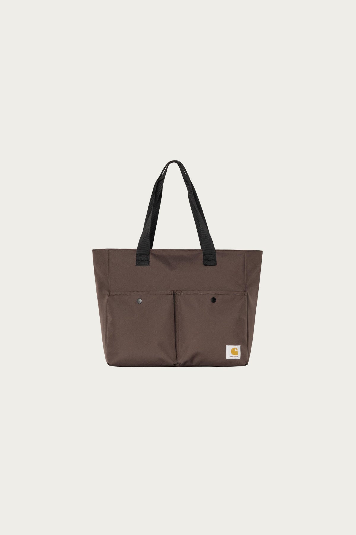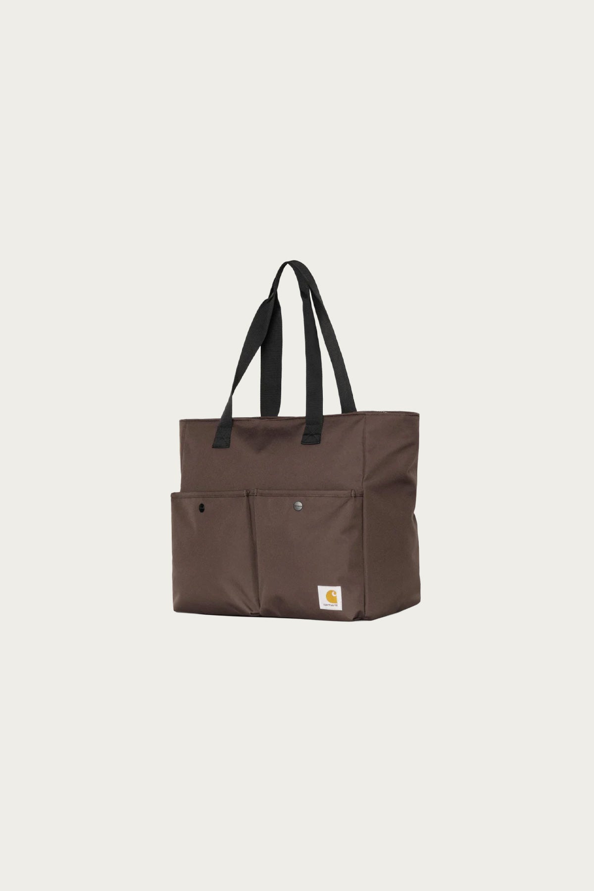 The Jake Tote Bag is made from a heavyweight polyester canvas. The style features a zipped main compartment. Two pockets appear on the inside, and two snap-button pockets appear on the outside. A woven Square Label completes the design.