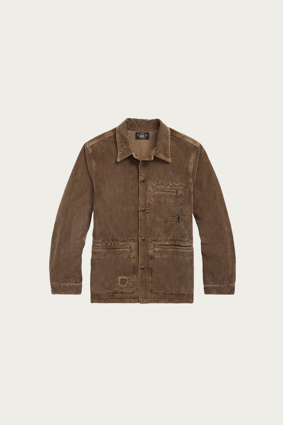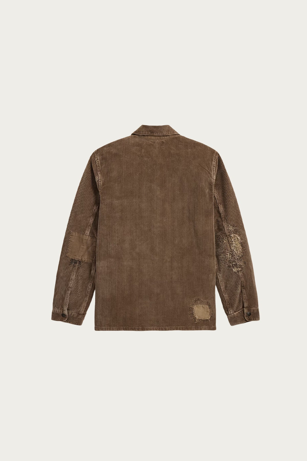 Made with wide-wale cotton corduroy that was sourced from a storied French mill that has been specializing in this type of fabric since the 1800s. Repaired with twill and contrasting corduroy. Heavily distressed for a lived-in look. Vintage-inspired custom snaps.