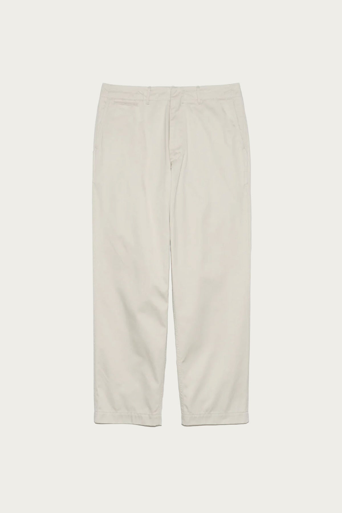 Chinos that blend timeless military shape with technical fabric for everyday comfort. The silhouette is wide with a soft taper, drawn from 1940s US Army trousers, and the fabric is a hybrid chino weave of recycled polyester wrapped in organic cotton for quick drying and durability. Practical features like the front zipper, concealed snap buttons at the back pockets, and a gusseted inseam make them ready for daily wear.