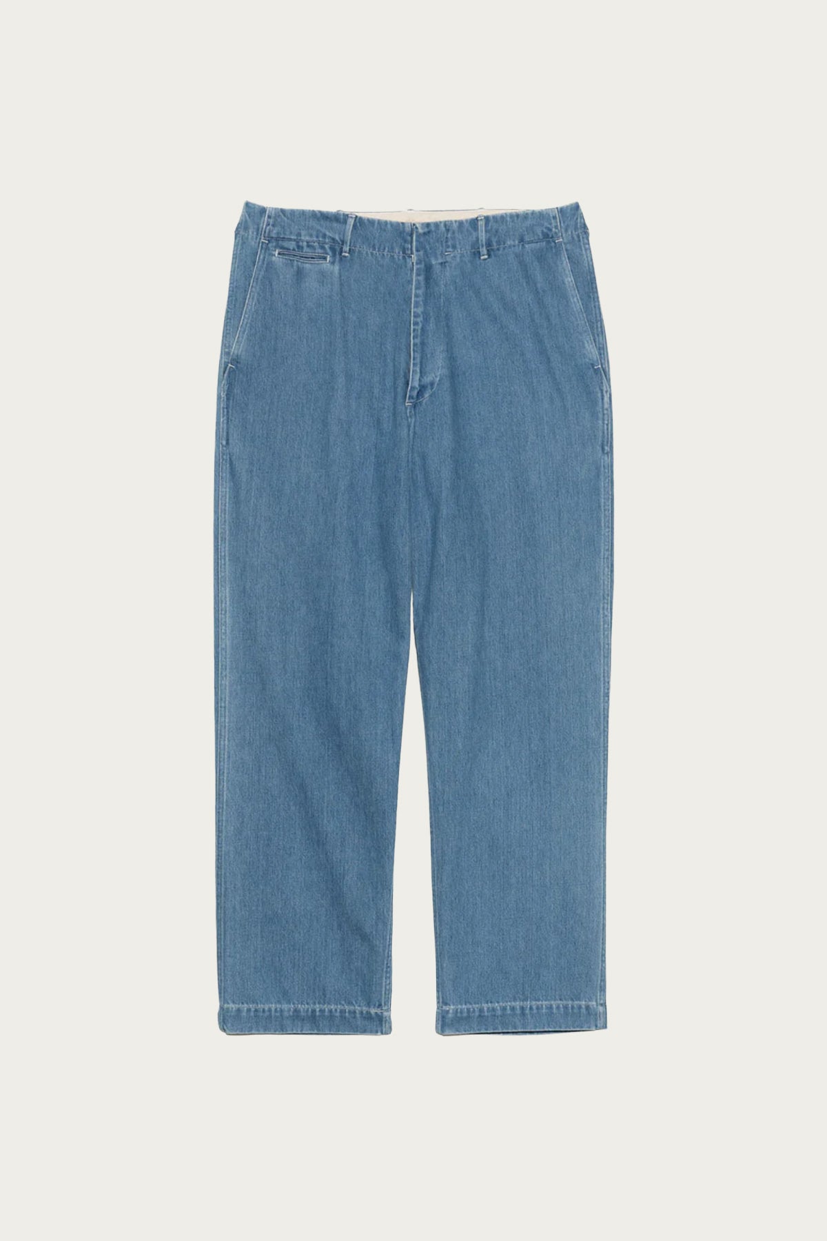 A pair of jeans with the comfort of broken-in favorites and the durability to stay in your rotation for years. The cut is wide with a gentle taper, modeled after 1940s US Army chinos, giving them a relaxed but purposeful shape. Made from rope-dyed denim where recycled polyester is wrapped in cotton, they balance softness with quick drying durability. A gusseted inseam adds mobility and small details like the concealed snap-button back pockets and zipper front make them practical for daily wear.