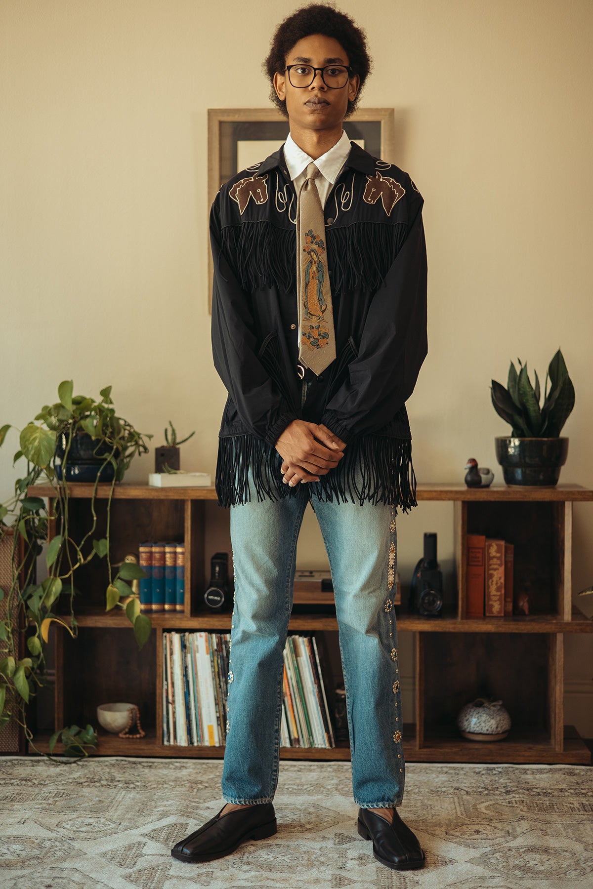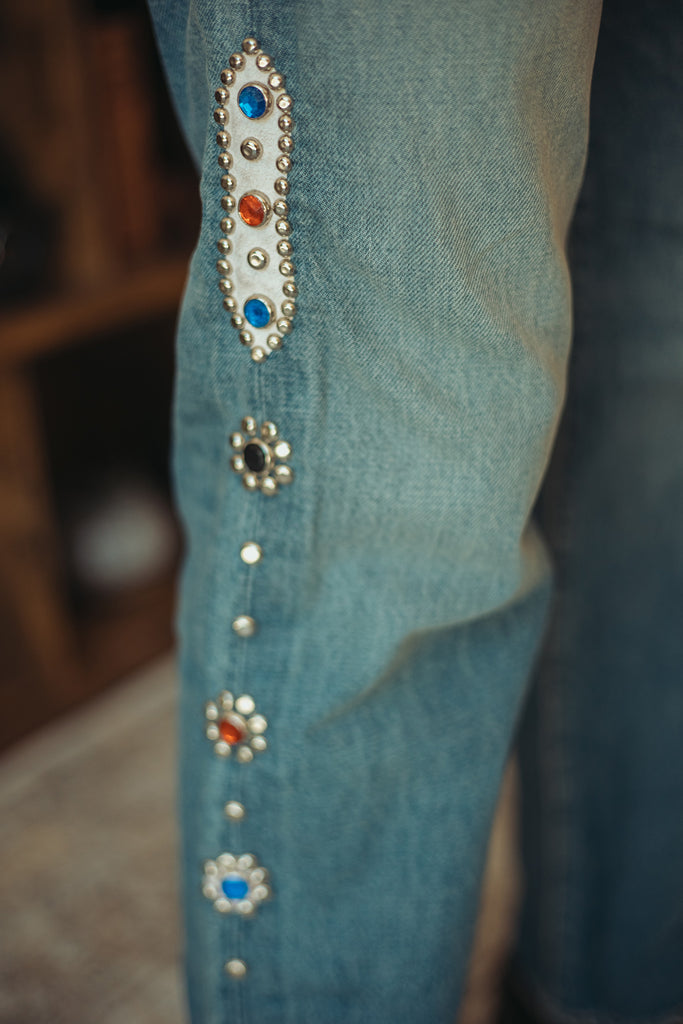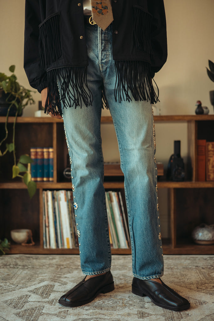 Kapital’s MONKEY CISCO silhouette returns in full force—this time with heavy metal attitude. Built from a rugged 14oz indigo selvedge denim, this pair delivers all the personality of Kapital’s signature vintage-inspired fit, now with a constellation of studs and Western flair straight out of a honky tonk fever dream.