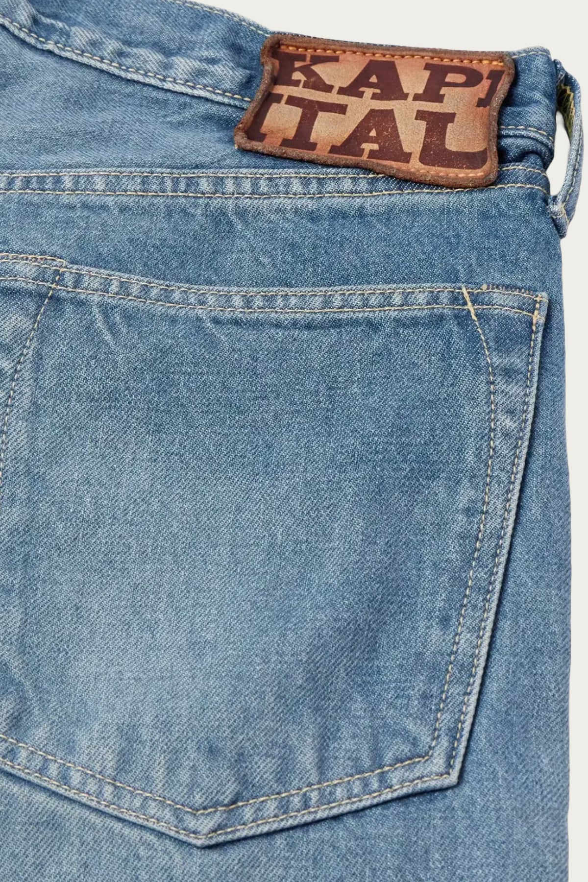 The MONKEY CISCO cut is roomy up top with a dramatic taper, offering a broken-in drape that feels lived-in and ready for anything. Kapital’s signature distressing and whiskering bring out the depth of the indigo dye, while the custom studwork across the back yoke and pockets brings rock’n’roll energy to an otherwise classic 5-pocket jean. Copper rivets, contrast stitching, and that iconic Kountry tag at the back complete the look.