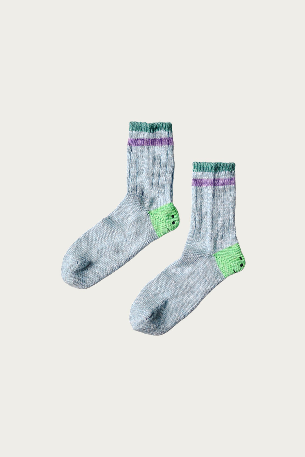 Kapital’s take on a daily essential is anything but ordinary. The 60 Yarns IVY RAINBOWY HAPPY HEEL-Hold Socks in Blue/Green turn your feet into a canvas of playful utility. Knit from soft cotton yarns with a satisfying hand, these socks feature Kapital’s signature mismatched charm.