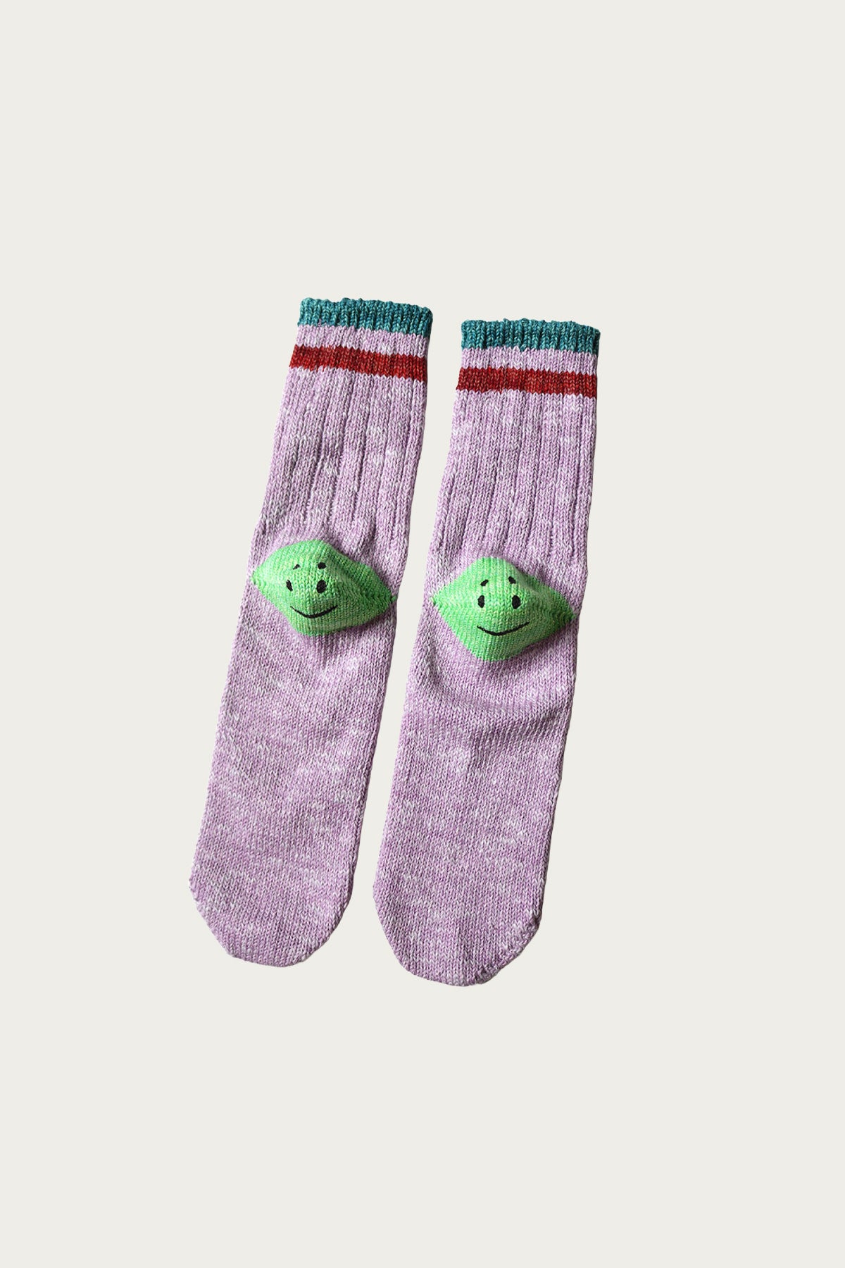 Kapital’s take on a daily essential is anything but ordinary. The 60 Yarns IVY RAINBOWY HAPPY HEEL-Hold Socks in Purple/Green turn your feet into a canvas of playful utility. Knit from soft cotton yarns with a satisfying hand, these socks feature Kapital’s signature mismatched charm.