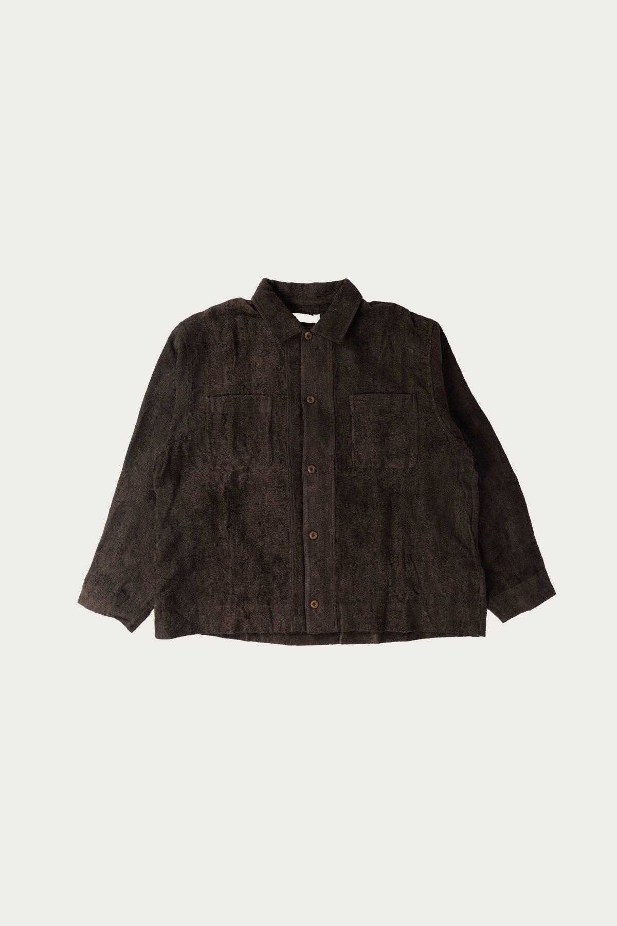 This shirt brings material contrast into play. A linen-velvet blend in warm carob tones gives shape and texture that moves beyond everyday basics. The fit is boxy and easy, making it a strong layering piece or standalone statement.