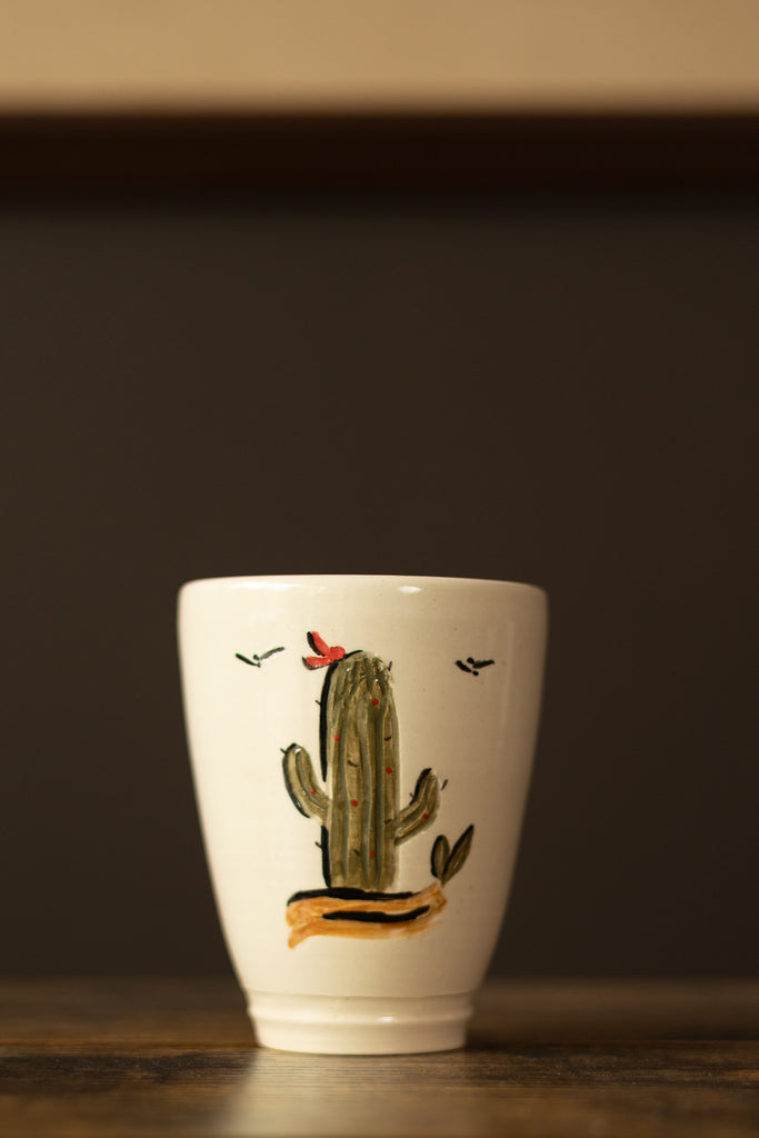 The Cactus Tumbler brings desert charm to your daily ritual. Hand-thrown and glazed by Danny D’s Mud Shop, each piece has a personality all its own — inspired by the quirky silhouettes and earthy tones of the Southwest. The form is organic and inviting, with just enough wobble and whimsy to remind you it was made by hand, not machine.