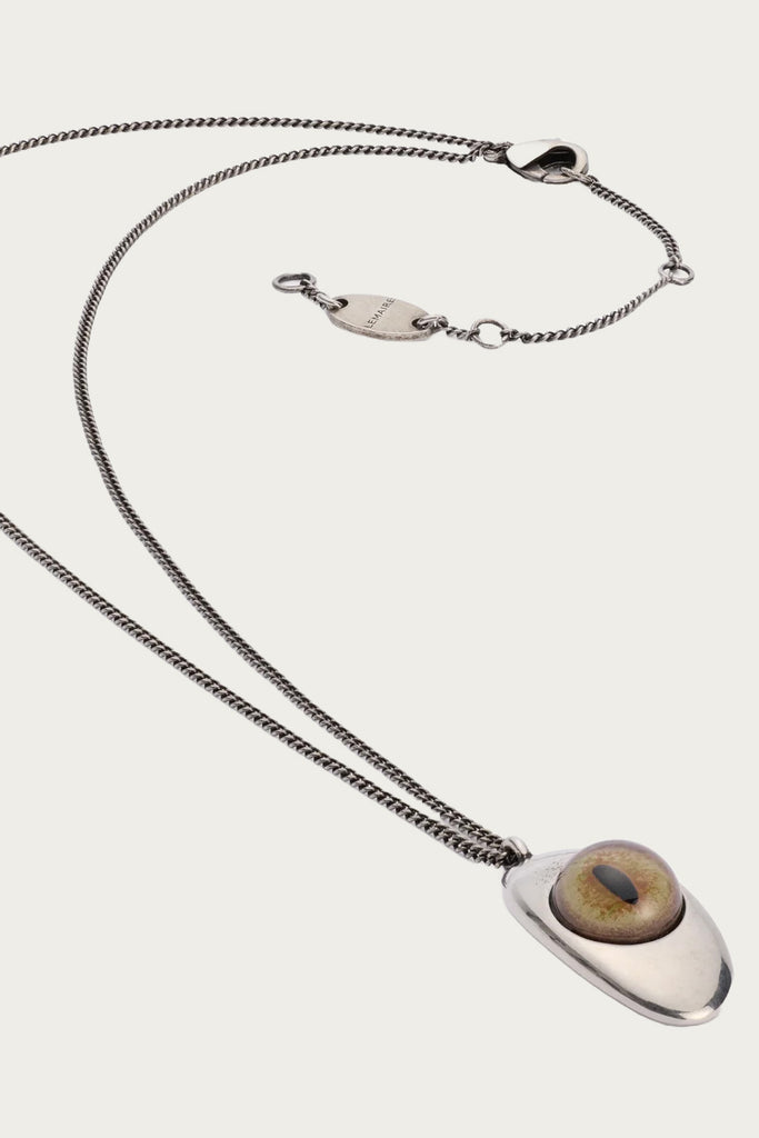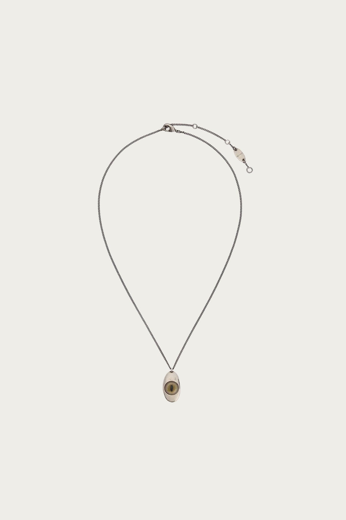 The playful Cat Eye line is enriched this season with this new jewelry proposition. This adjustable Cat Eye Rattle necklace is sculpted in brass with a brushed silver finish. It features a bean-shaped pendant encrusted with a surrealist cat eye and will add light and intrigue to any look.