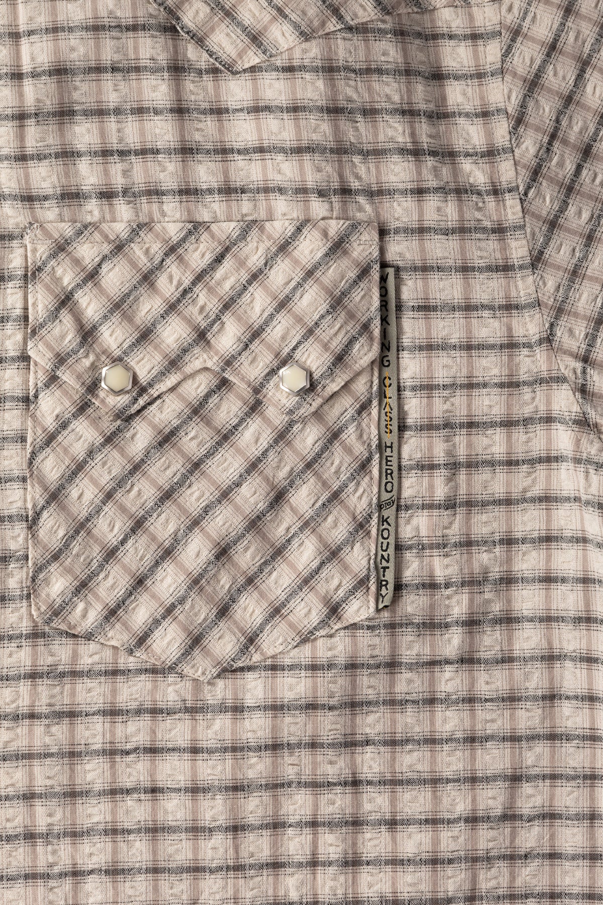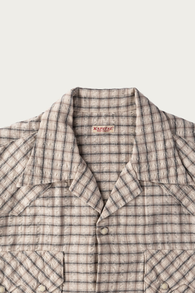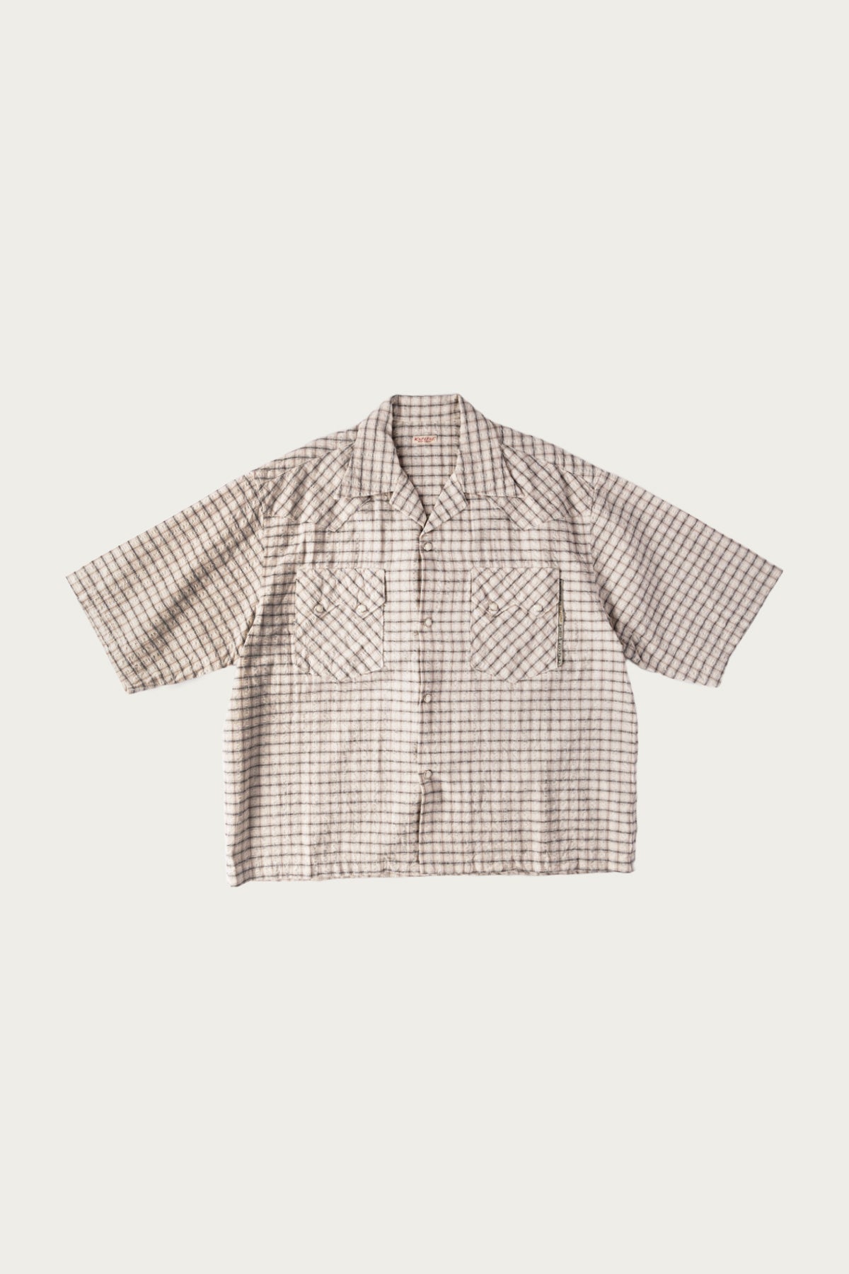 Cotton Linen Seersucker Check Open-Collar Western BIG Shirt - Black