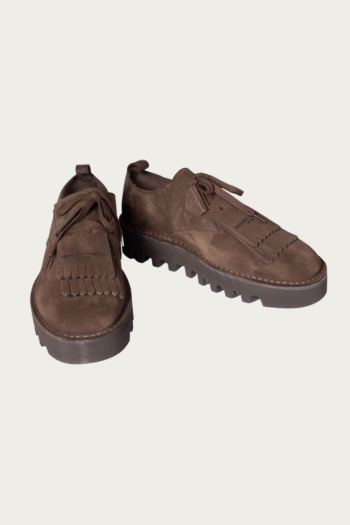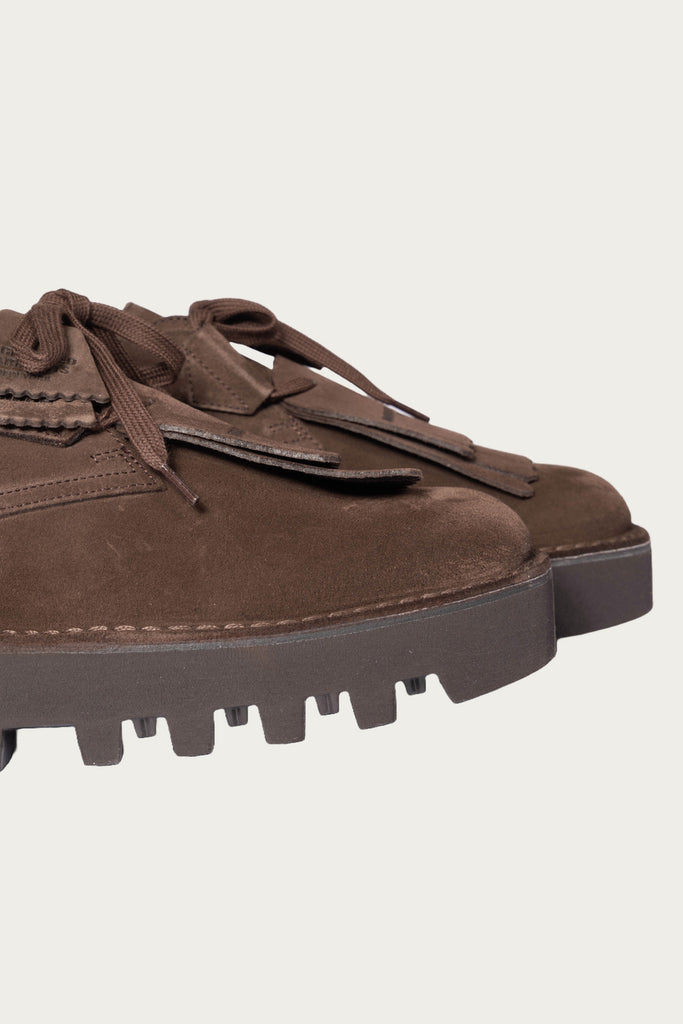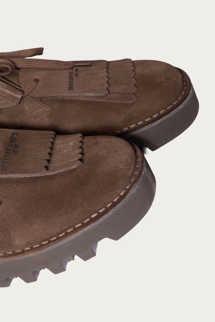 One foot laces with D-rings, the other with blind eyelets. A removable fringed kiltie floats on top, nodding to both western styling and Ivy formality. The suede is rich, open-pored, and just rough enough to break in beautifully. Underneath, a Vibram® Morflex sole adds bounce and lightness-- a modern switch-up from the usual crepe.