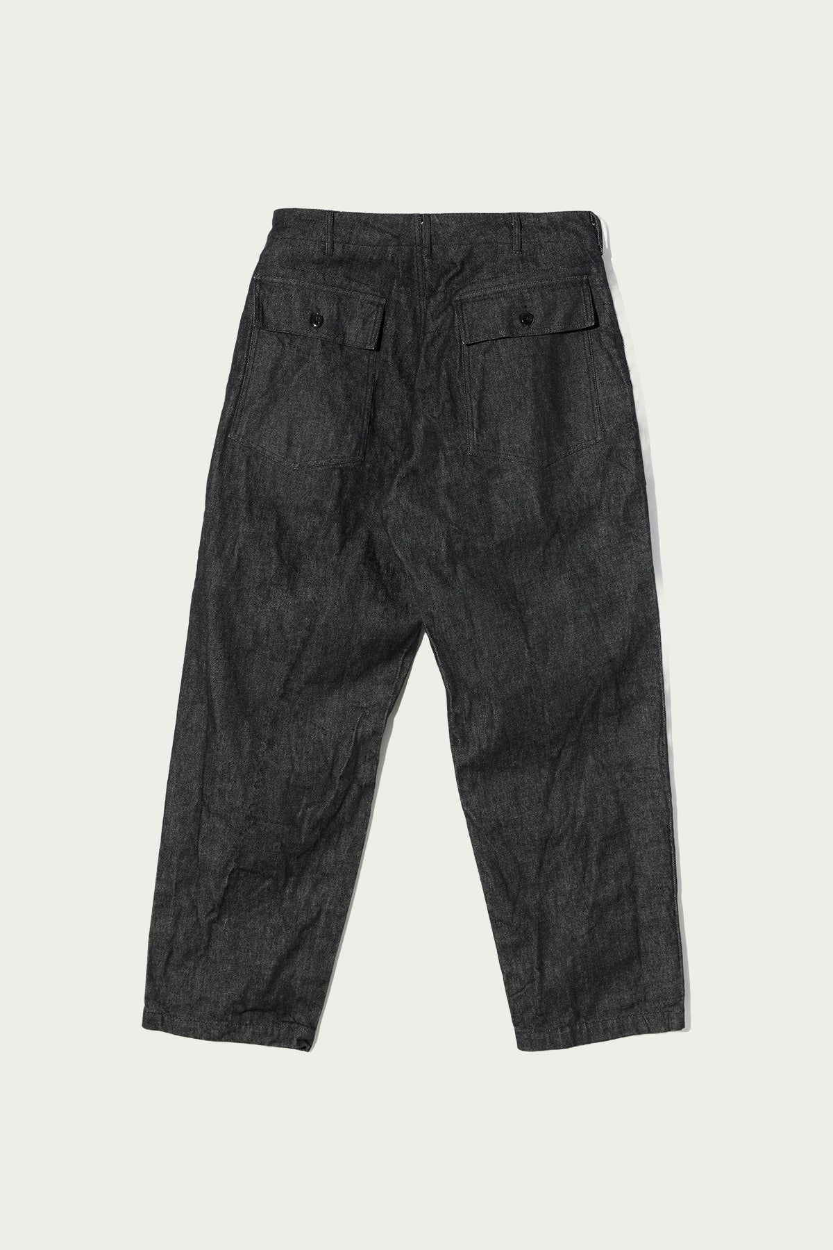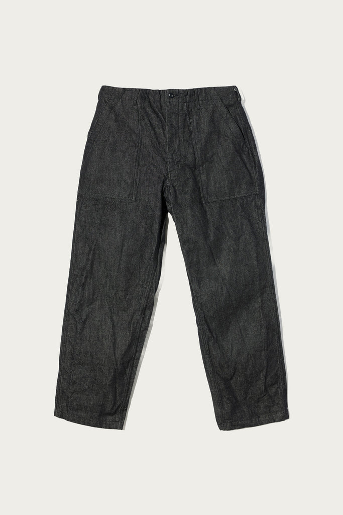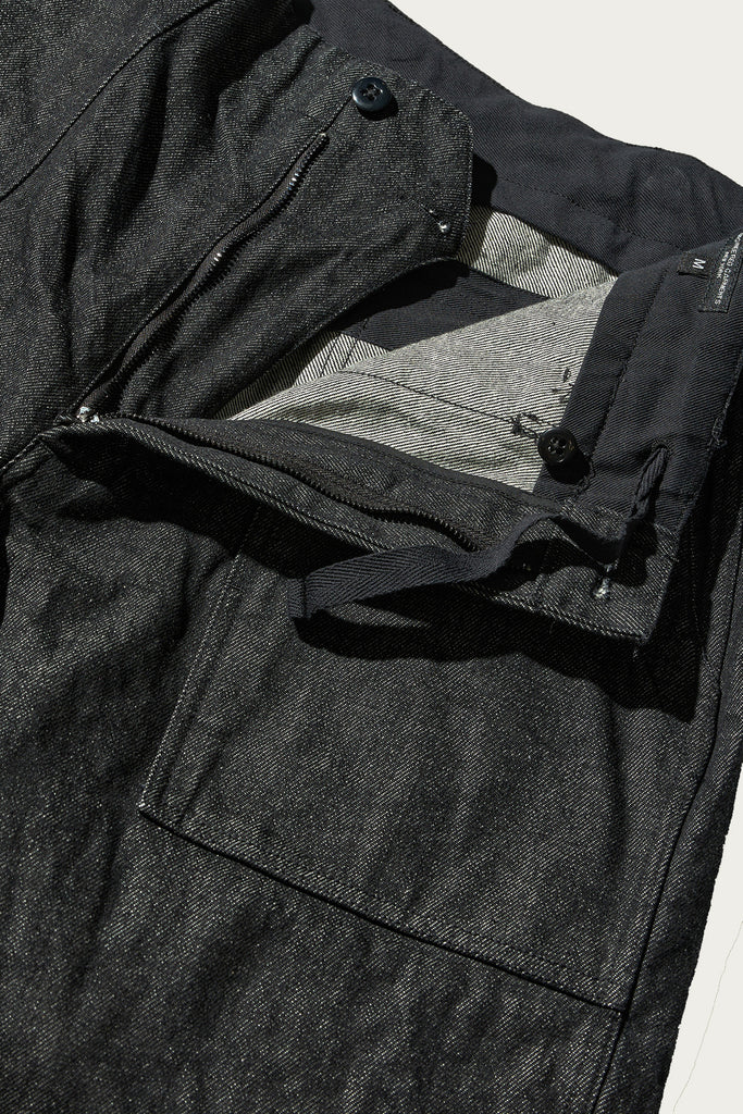 Engineered Garments reimagines its essential fatigue pant in a weighty 14oz Cone denim that feels substantial without sacrificing comfort. This version carries the same military lineage as the original—classic patch pockets, adjustable drawstring, and a straight-leg cut—but the black denim brings in a sharper, cleaner attitude. With time, the rigid fabric will soften and take on deep character through wear and wash.