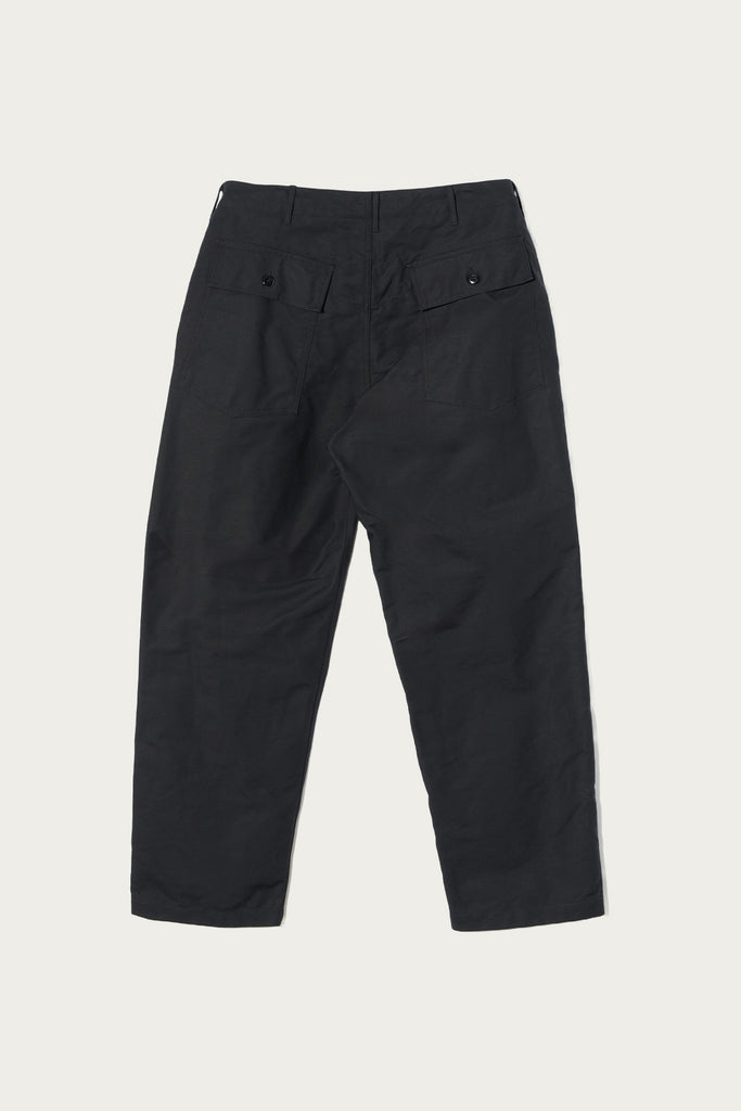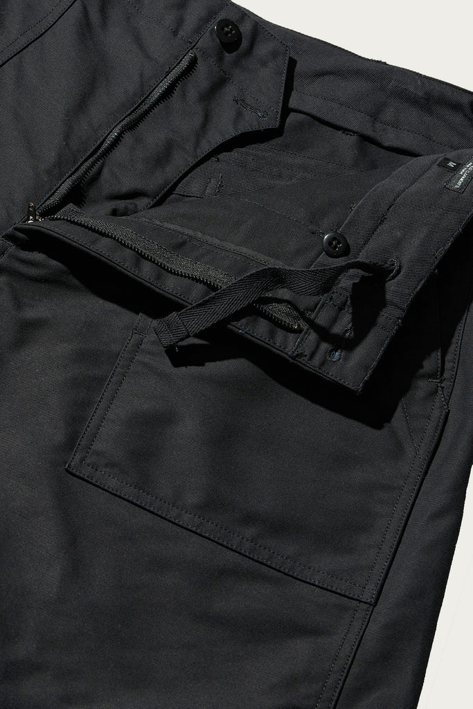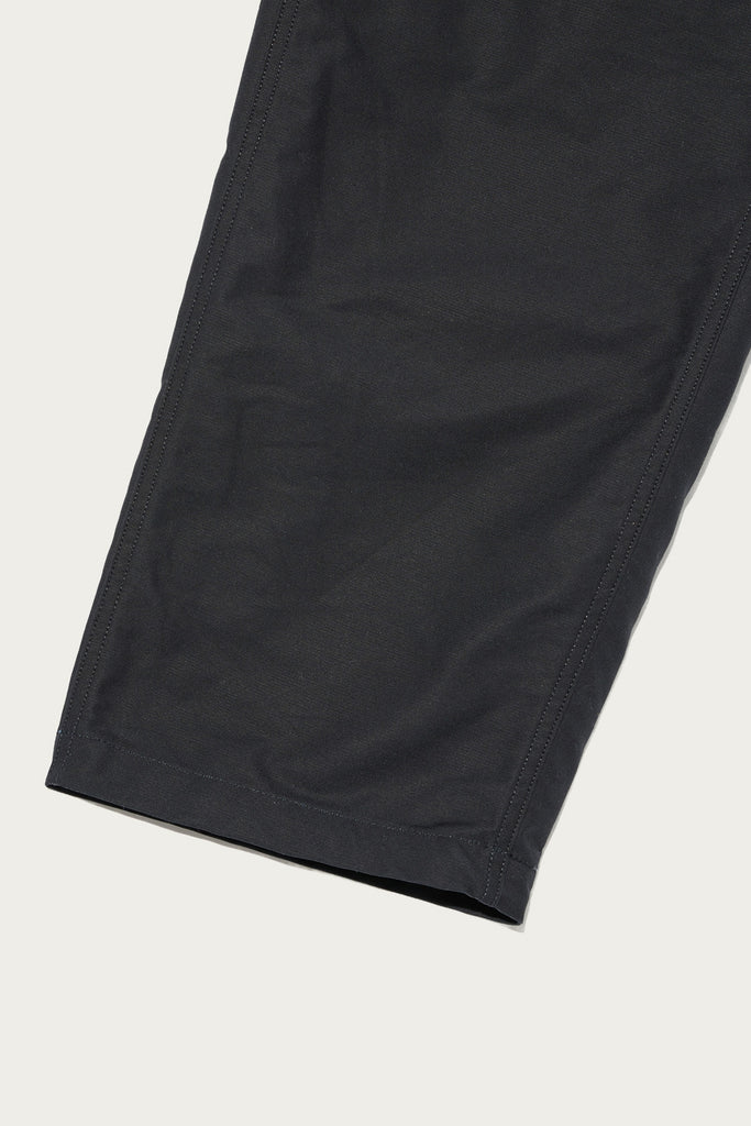 A core EG silhouette crafted from a breathable but structured double cloth. These fatigue pants feature patch front pockets, rear button-flap pockets, and adjustable drawstring for a tailored fit without tailoring. The black tone dresses up easily-- toss it on with a wool blazer or chore coat for an effortless office-to-evening rotation.