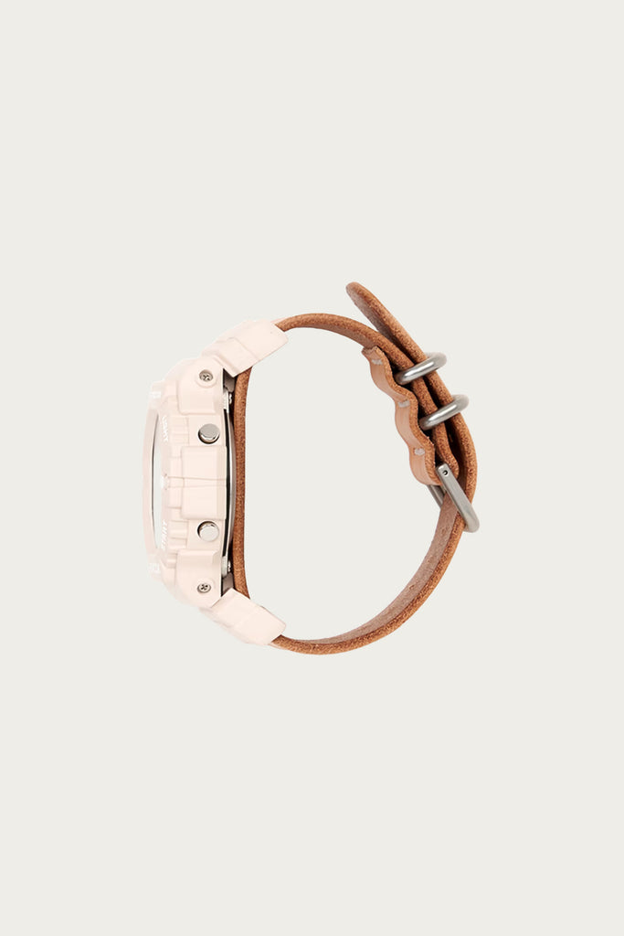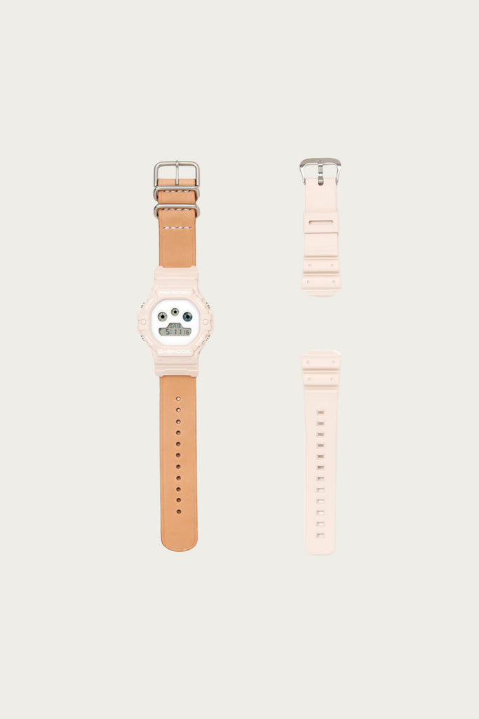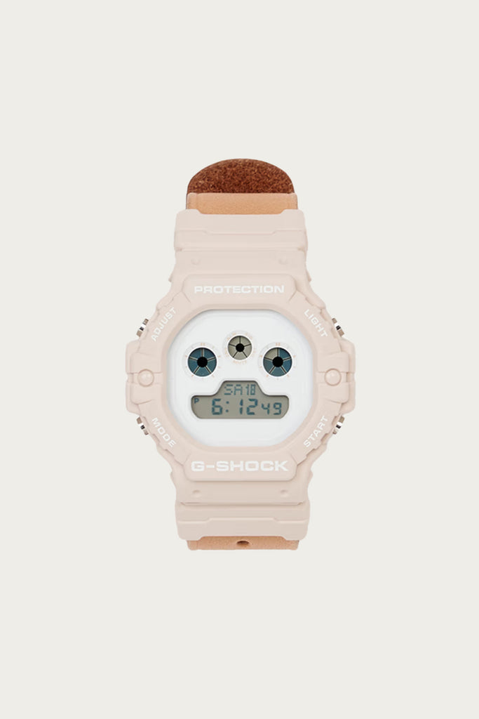 This is still a DW-5900 at its core-- shock resistant, water resistant up to 200M, with stopwatch, countdown timer, and alarm functions, but now softened and elevated with hand-stitched leather details that will patina and darken beautifully over time.