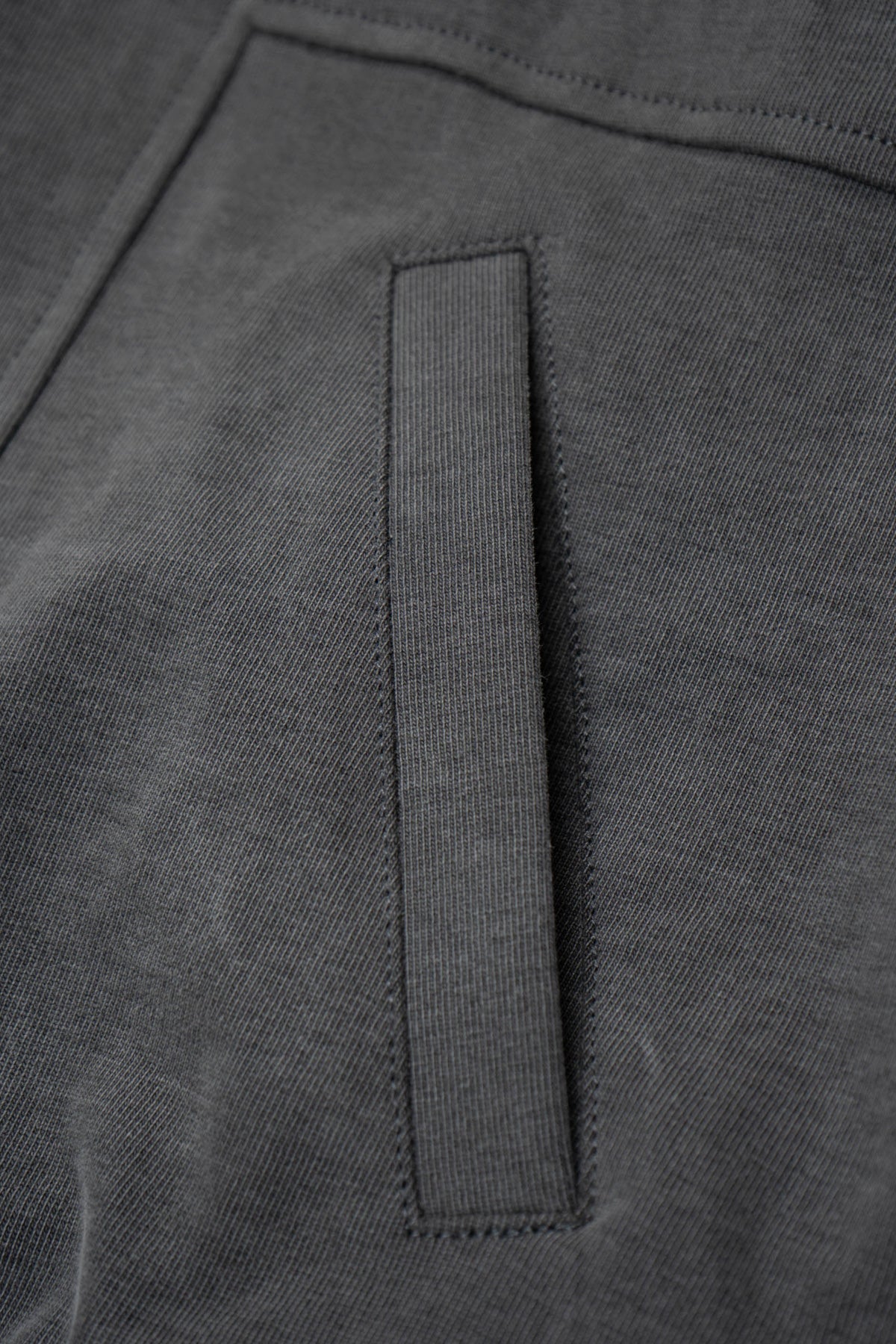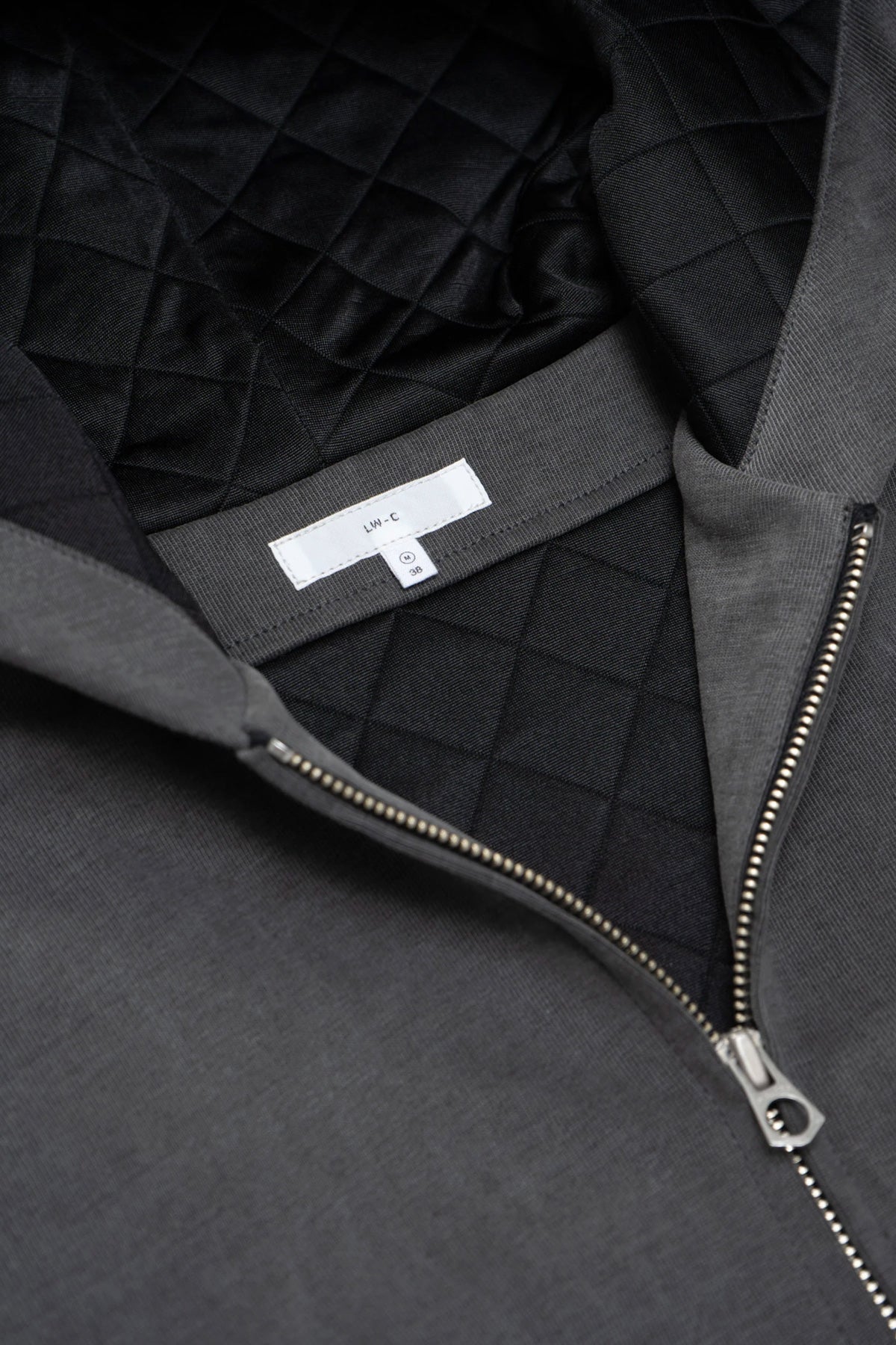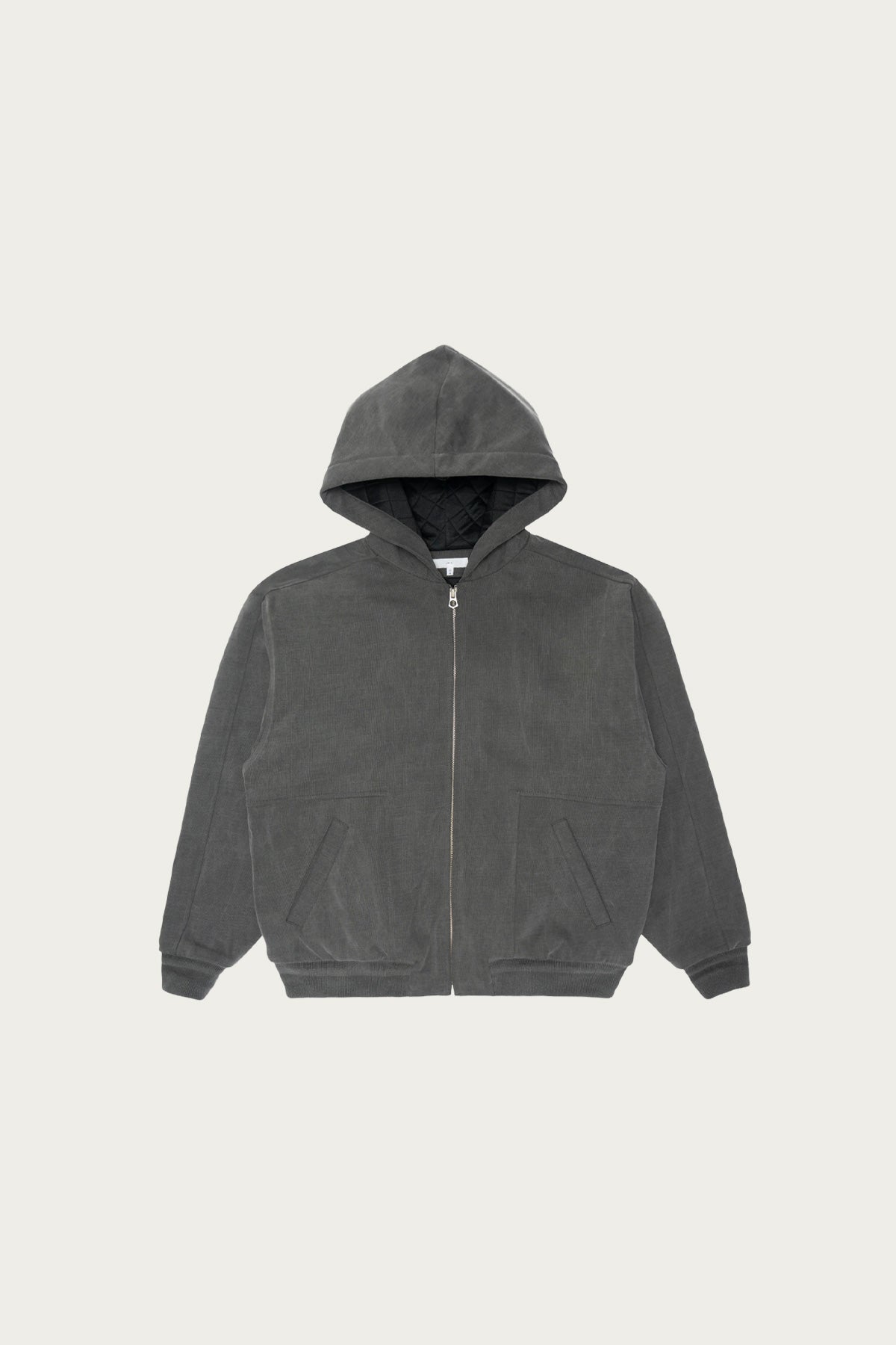 A hooded variation of the Barrington silhouette in a rich Black Mushroom shade. The fabric has a velvety, brushed surface that reads elevated without feeling precious. An insulated interior and ribbed hem give it a subtle varsity feel.