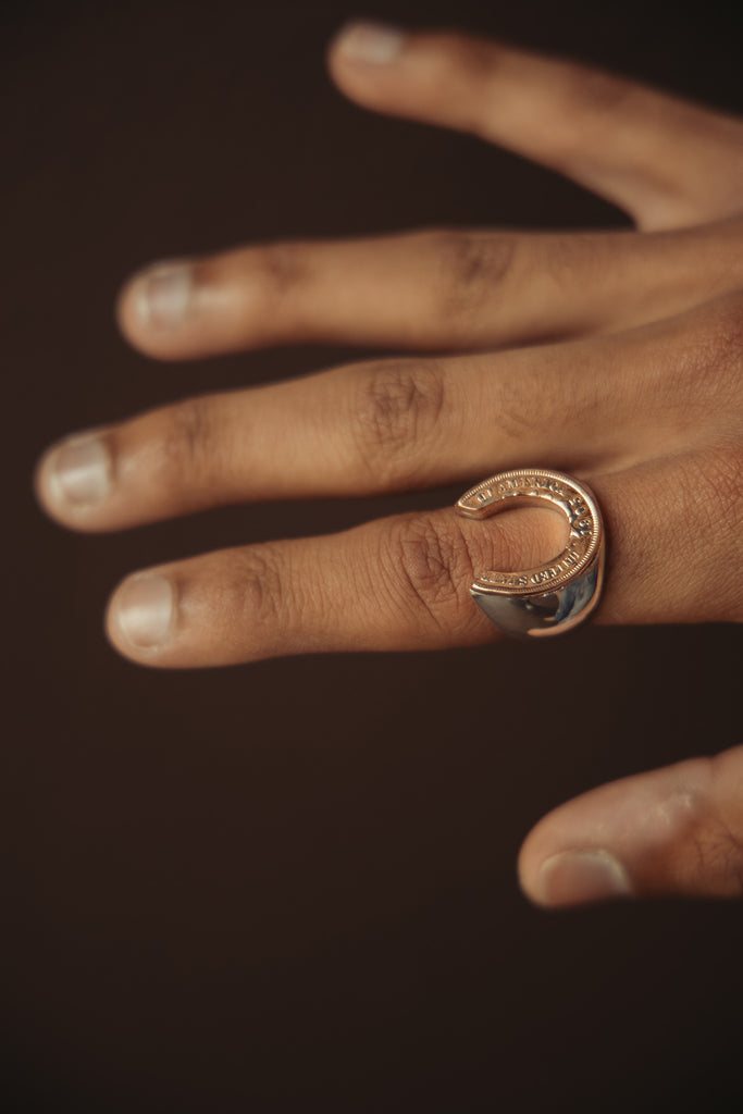 Inspired by the 1960's alternative jewelry making process of using old coins as a bass for silver casting, Northworks uses the vintage Morgan Dollar coins from the 1800's as a bass for their pieces, transforming them into something with an entirely original point of view with the details of the past sneaking through. This ring is made from vintage morgan dollar and a copper inlay to create the classic good luck horseshoe ring often worn by bikers.