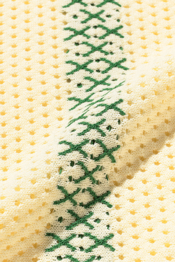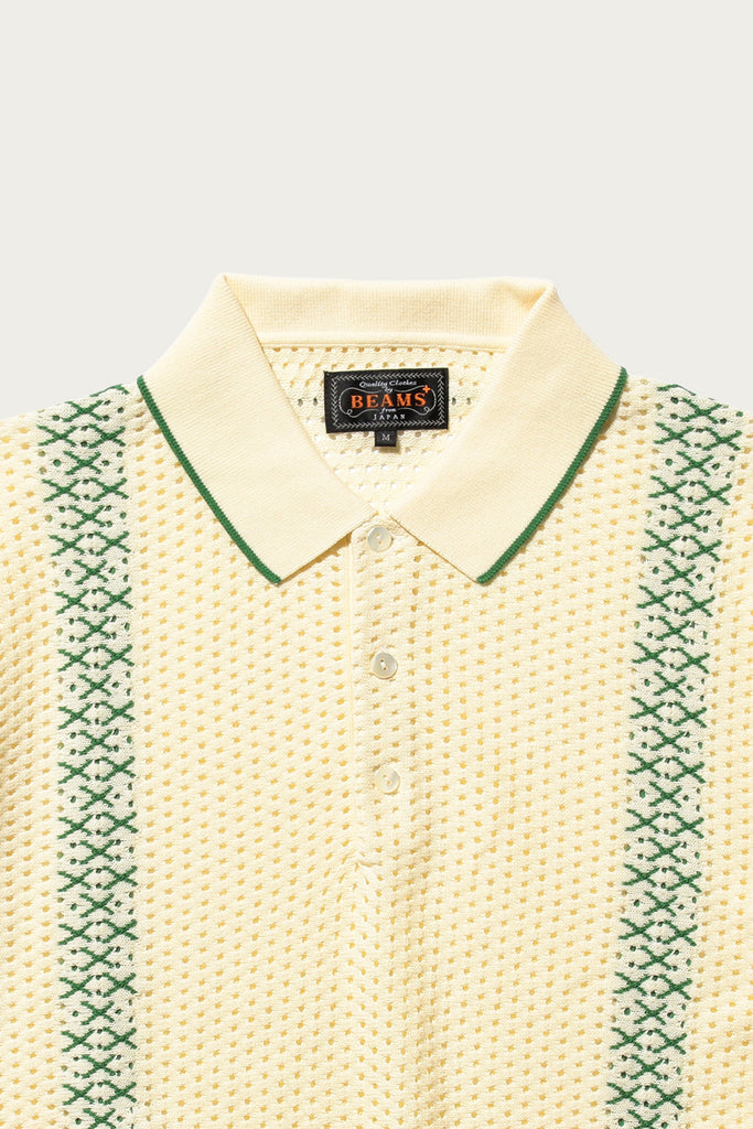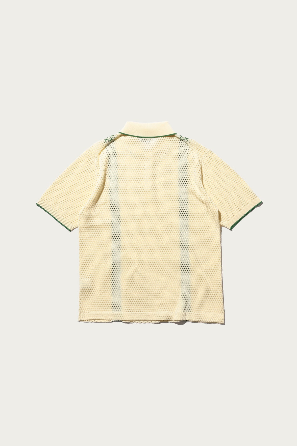 This knit polo offers a cozy yet breathable option for summer. Made from soft cotton yarn, it features a rib-knit polo collar with contrast stripe details and a loose-knit mesh texture for ultimate breathability. The three-button placket and straight split hem add to its relaxed fit and comfort.
