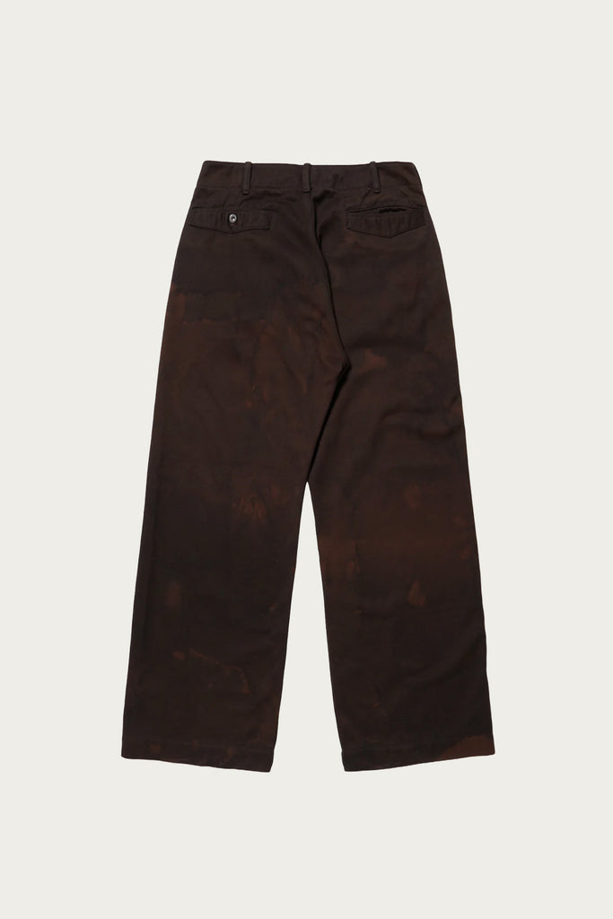 The engineer trousers draw inspiration from 1940s workpants, when fabrics were not strong enough for heavy work. Each pocket opening is reinforced with a patch that mimics the rivets found on jeans. These high-rise trousers have a wide silhouette from thigh to hem. Made from our original twisting-mottled whipcord, the fabric is a result of our examination of vintage swatches. The reverse side is lightly brushed, giving it a horsewhip appearance, from which it derives its name "Whipcord." Mix Brown Colorway.