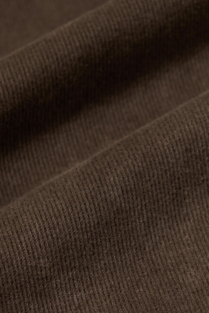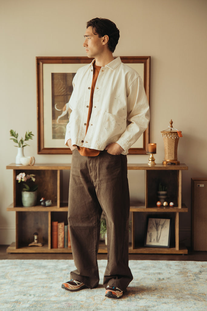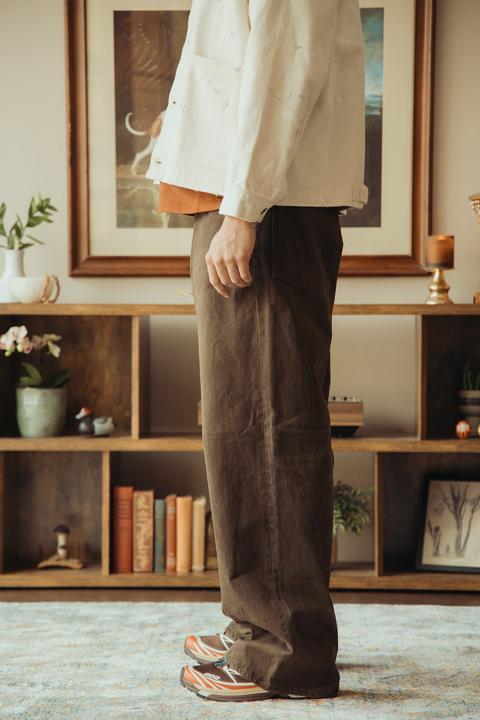 LOT.209 Buckle-Backed Trouser is a unique version of LOT.704 Denim Trousers c.1920’s. These high-rise pants feature a wide silhouette with straight vertical lines from thighs to hems, while preserving essential design elements such as round curves on the front pockets and a buckle-back on the backside. Produced using an original dense west-point fabric (=uniform twill) woven on an old-type power loom, which is typically used for the uniforms of the United States Military Academy at West Point. The fabric, known for its dense and glossy finish, is made of two ply fine combed cotton yarn, making it thinner than regular chino cloth and originally designed for senior officers’ uniforms. The DAMAGED MUD DYED BROWN color is achieved through careful traditional dyeing techniques of Amami Oshima, adding a distressed effect for a worn look. The iron buckle on these trousers is an original design created from a mold.