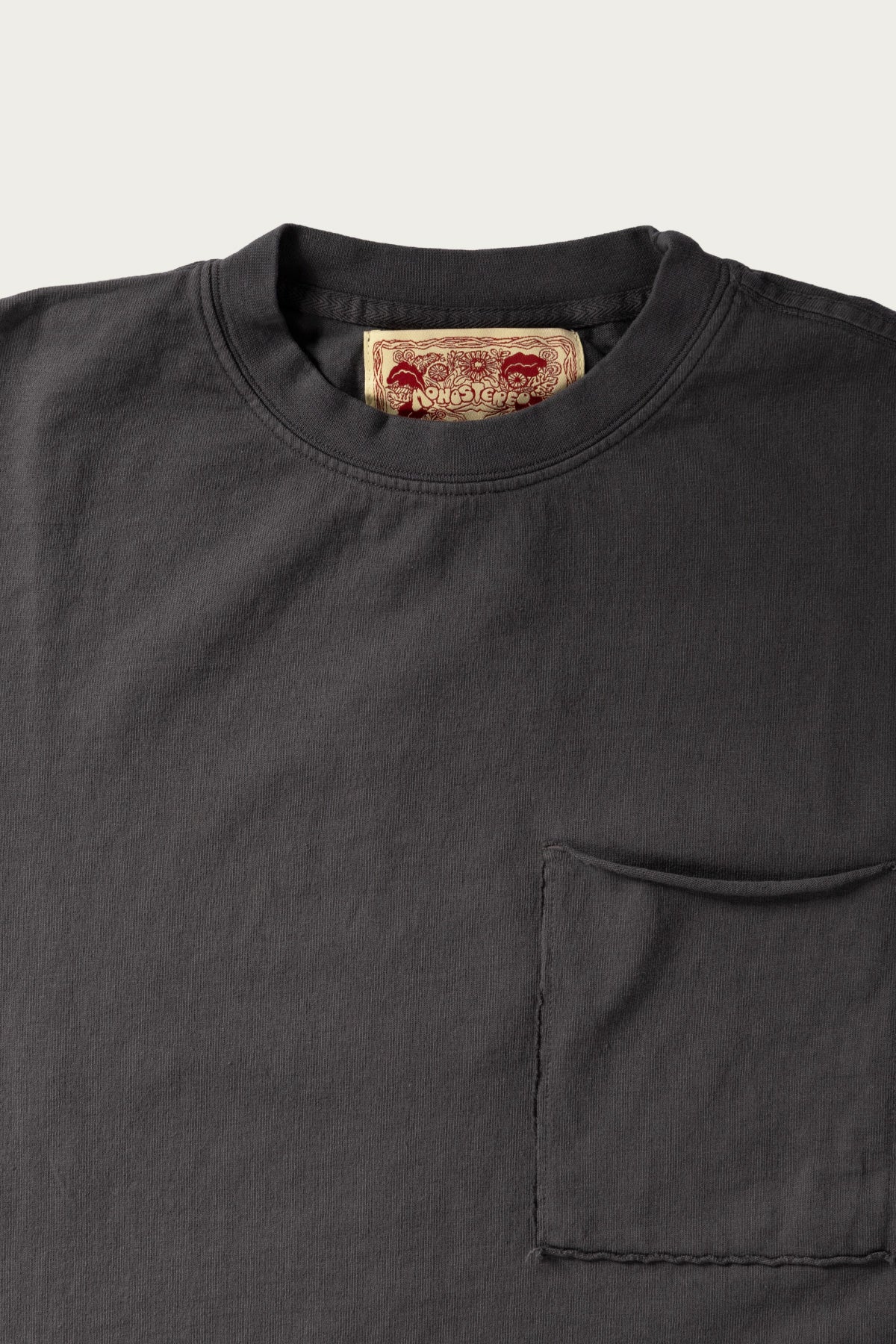 Slightly cropped raw hem tee hits just below the waist band of your pants. The shirt body width and sleeve length are similar to a classic fitting long sleeve t-shirt - not to slim, but not oversized. MonoStereo logo embroidery on back of tee.