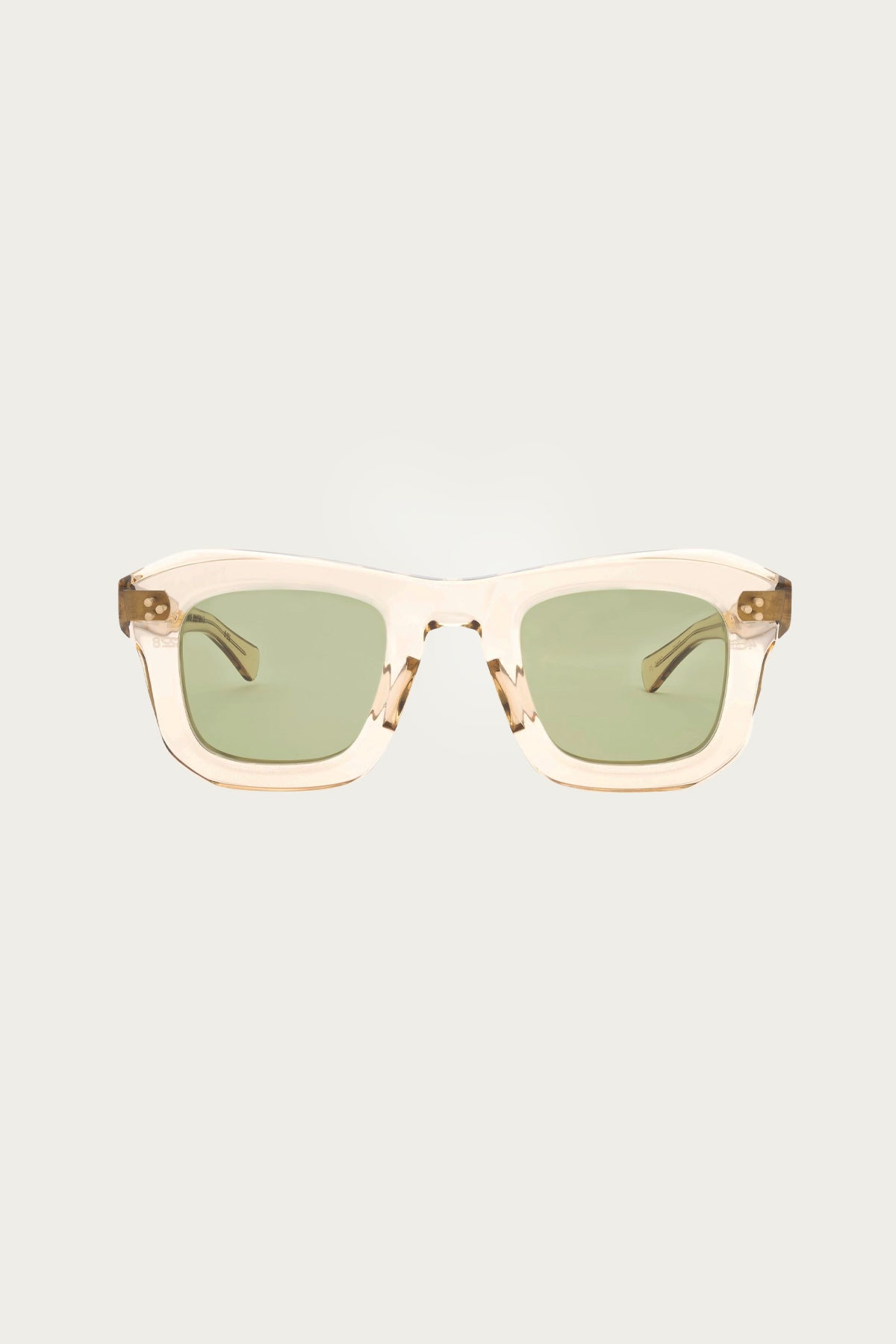 The upper bridge dips sharply at center and rises with intention toward the temples, peaking at a 22-degree angle before diving into fully three-dimensional bevels. Thick, weighty rimlines are deeply sculpted, ending in a distinctive cut-off at the outer bottom corner. It's not subtle—because it wasn’t meant to be.