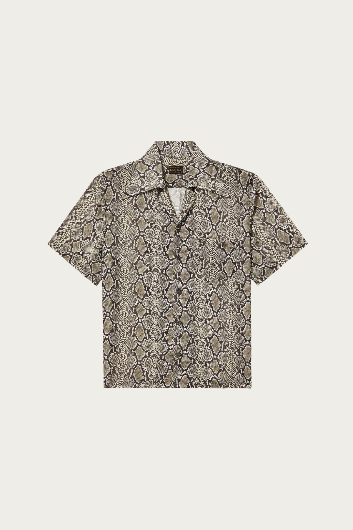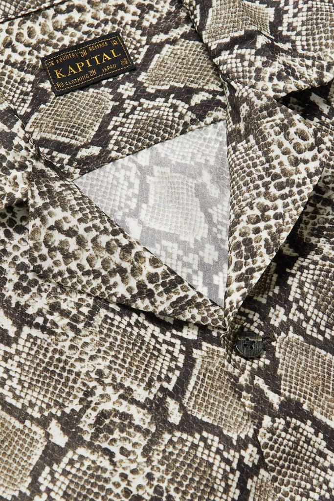 Fluid, breathable, and dangerous in the right way. This Aloha shirt features Kapital’s beloved python motif printed over a silky rayon body that drapes effortlessly off the shoulders. The open camp collar and western yoke add that subtle tension between tropical ease and cowboy swagger. Pair with shorts or worn-in denim and let the shirt do the talking.