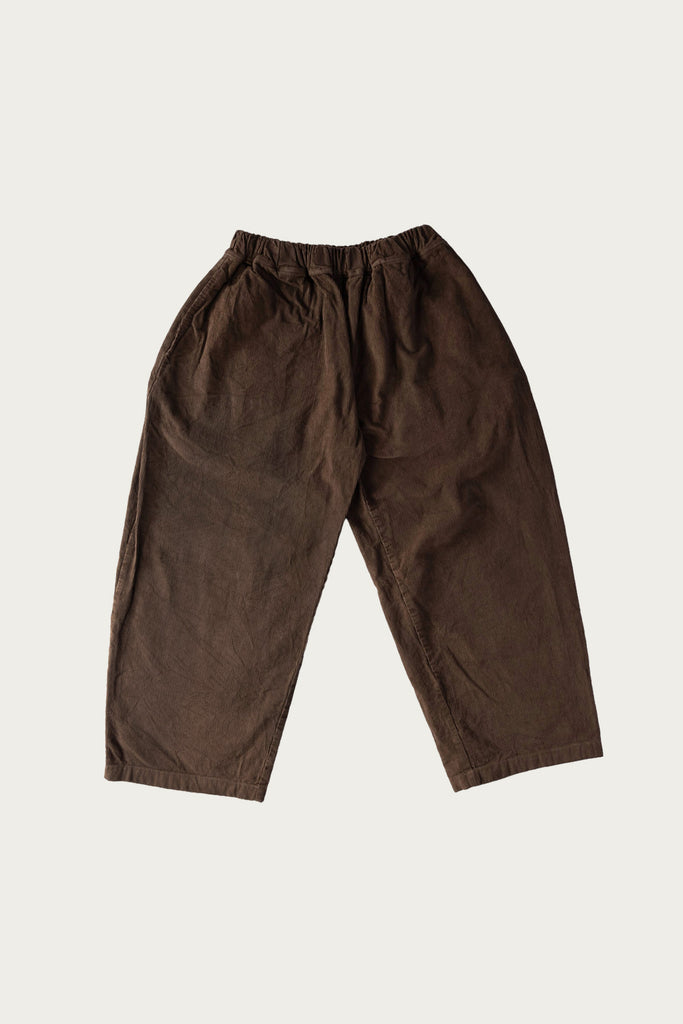 These wide-leg, barrel-shaped pants feature an elasticated waist and two hidden side seam pockets. Made from a naturally dyed cotton corduroy, the fabric offers a textured, durable feel. The color has a dusty brown tone, perfect for cold weather styling.