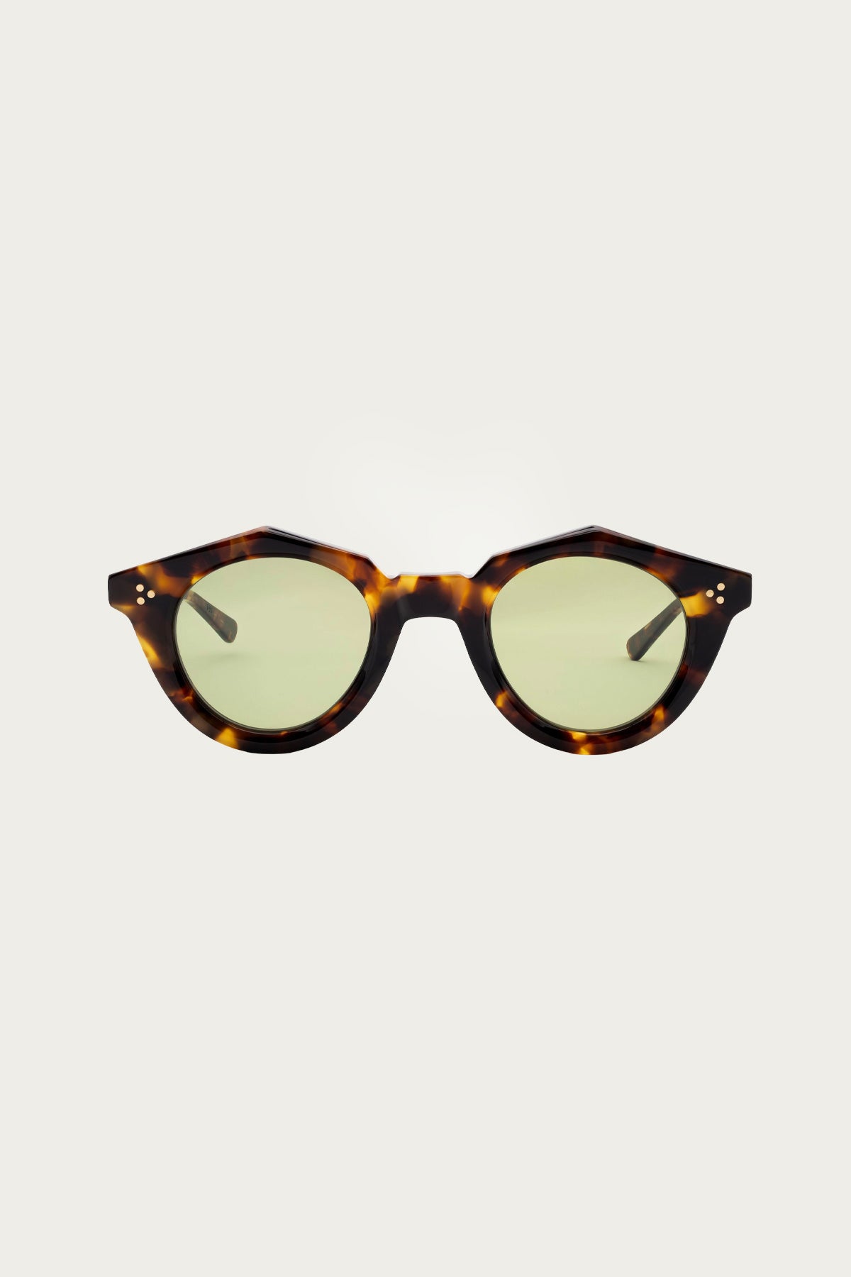 Brass triple-rivets at the front and double horizontals on the sides anchor the design, while a heavy-duty 5-barrel hinge gives it lasting strength. The temples follow a straight line before dipping just ahead of the ear, finishing in a squared, slightly uplifted tip that keeps the silhouette crisp and elevated.